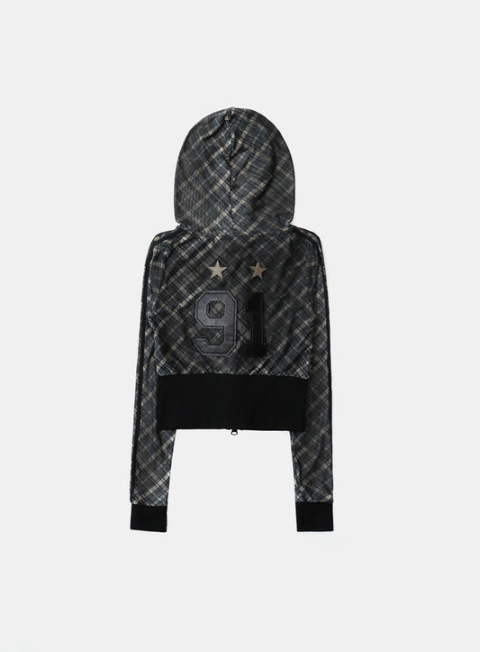 [w-hde25-019] 复古俱乐部修身连帽拉链外套 - 黑色格纹