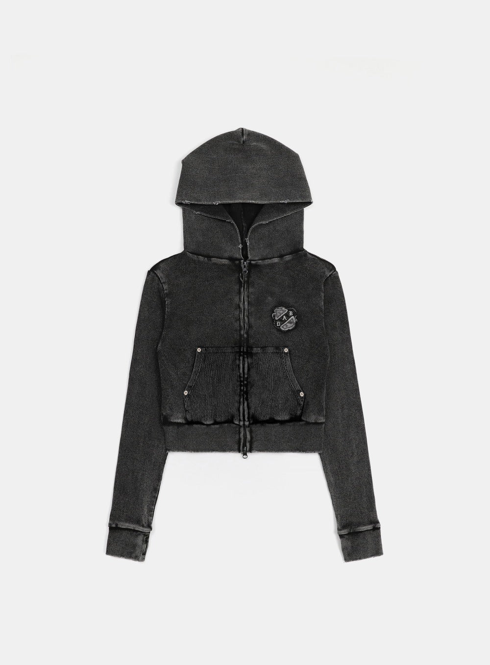 经过盐洗工艺处理的棉质面料,呈现出复古牛仔色调的 Rusty Denim Slim Fit 连帽拉链卫衣。