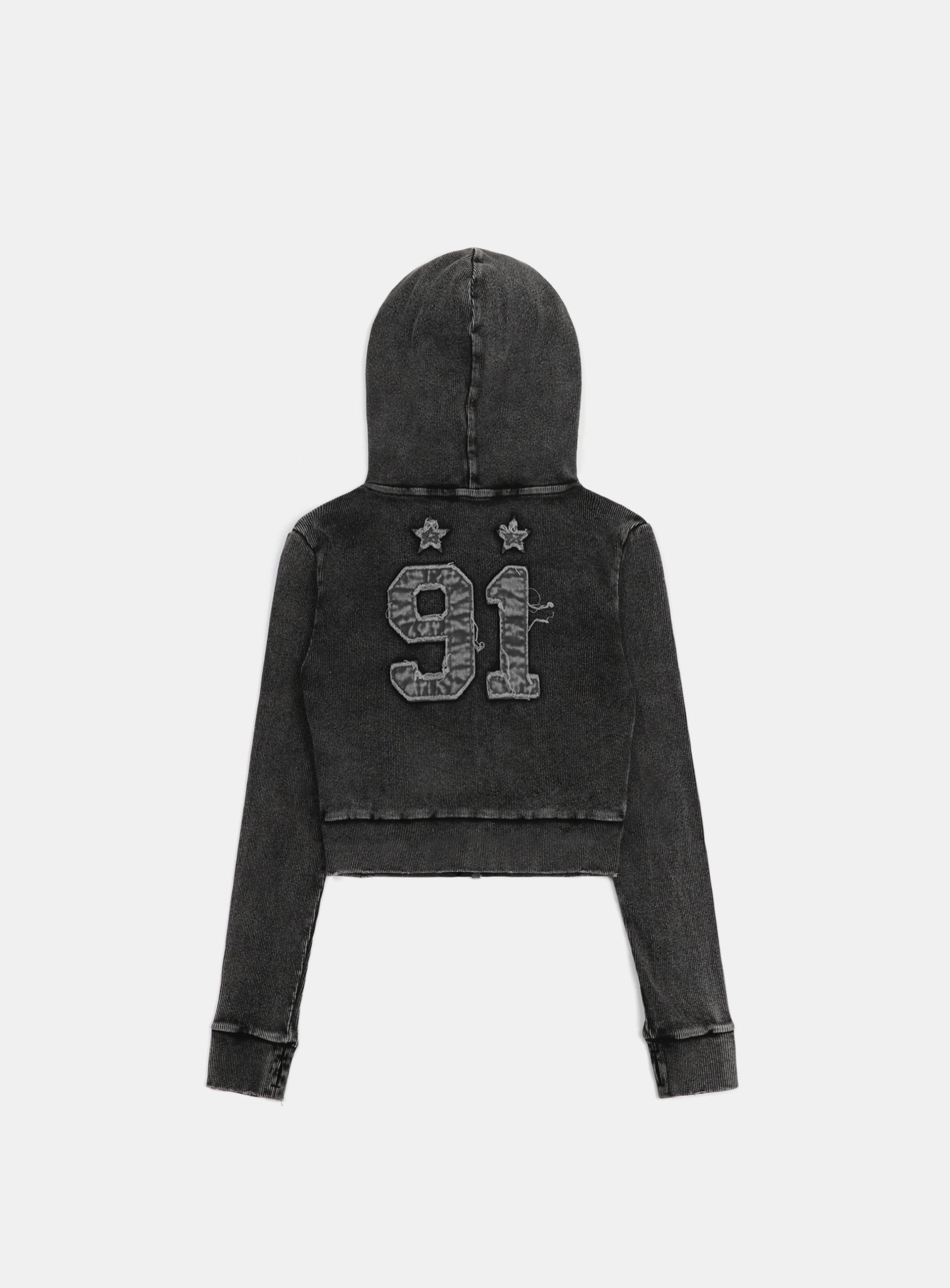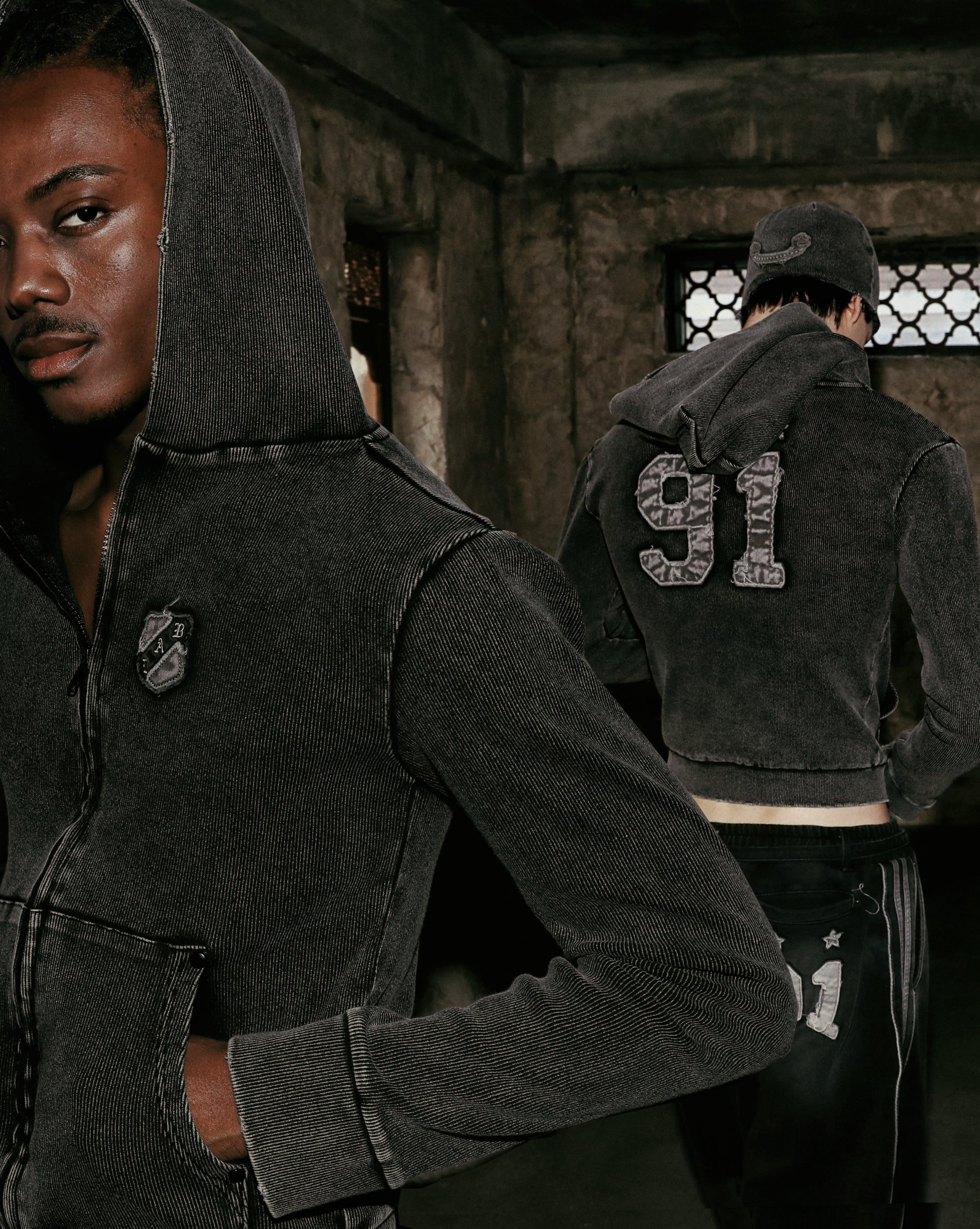 连帽边缘、下摆及袖口采用 破坏感细节设计,搭配 双向拉链,正面 铆钉装饰袋鼠口袋,袖口设有 指洞设计。