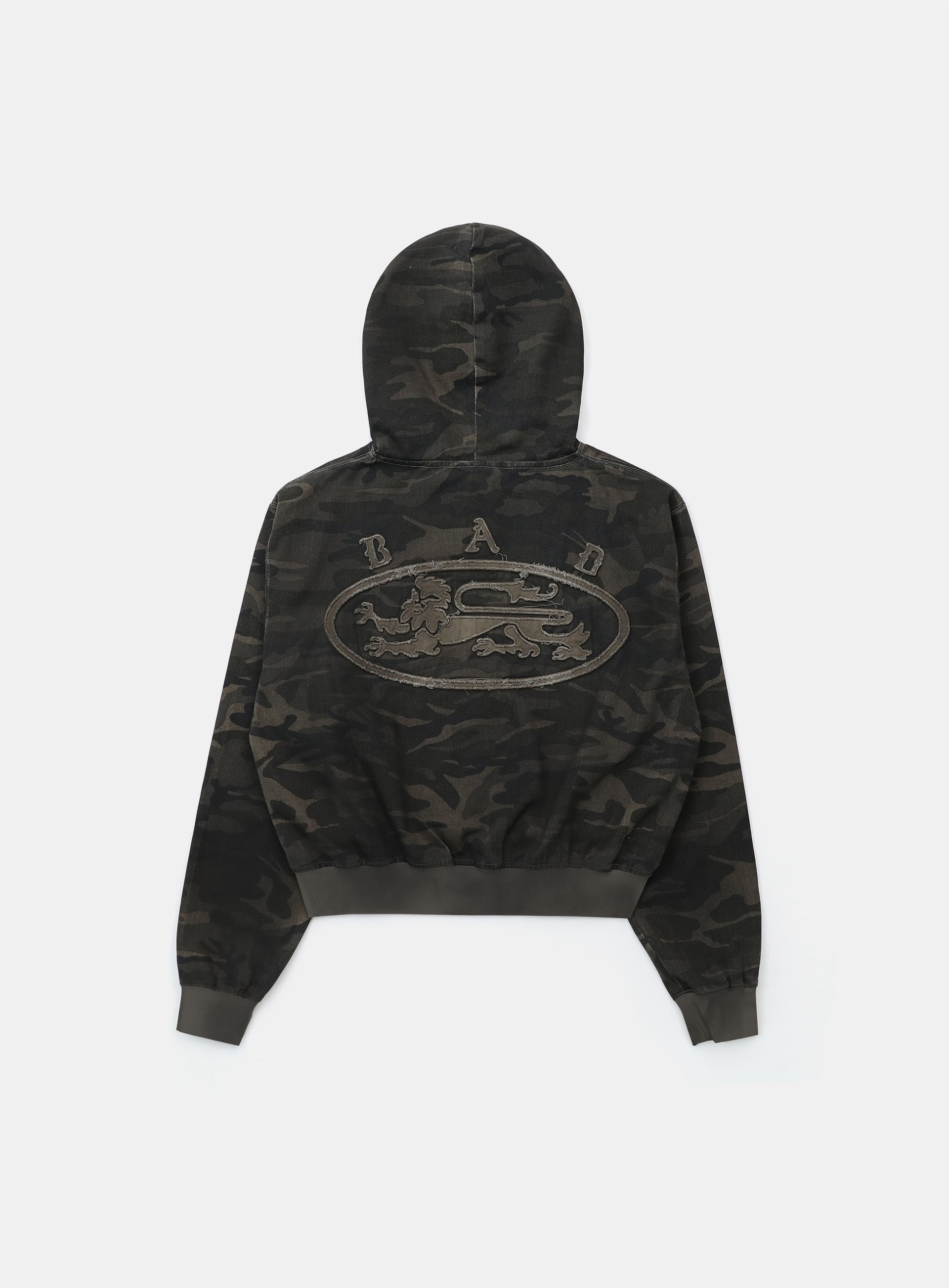 这款连帽拉链卫衣采用斜纹棉面料制成,质地坚挺,街头风格十足,搭配迷彩图案和狮子补丁设计。