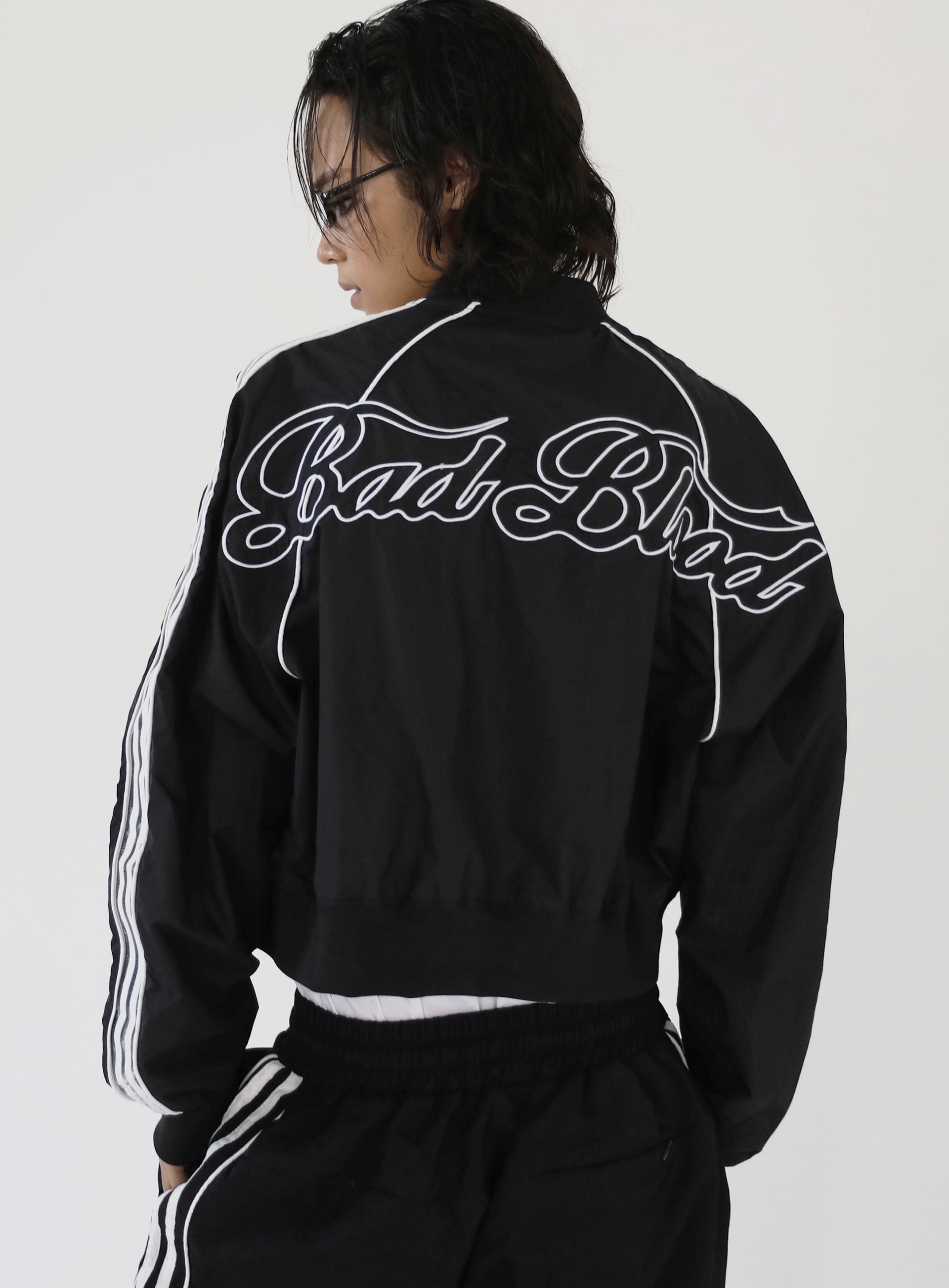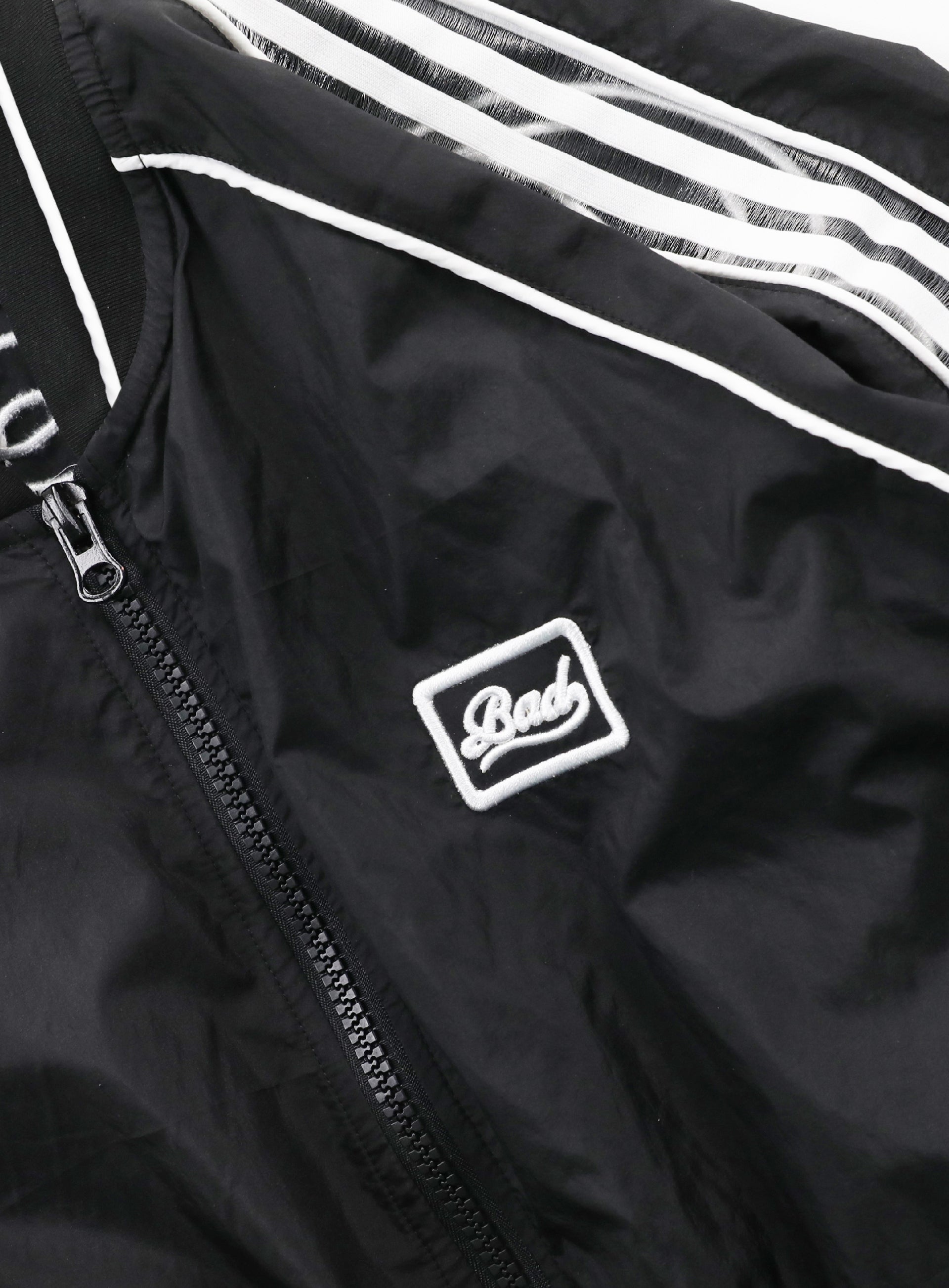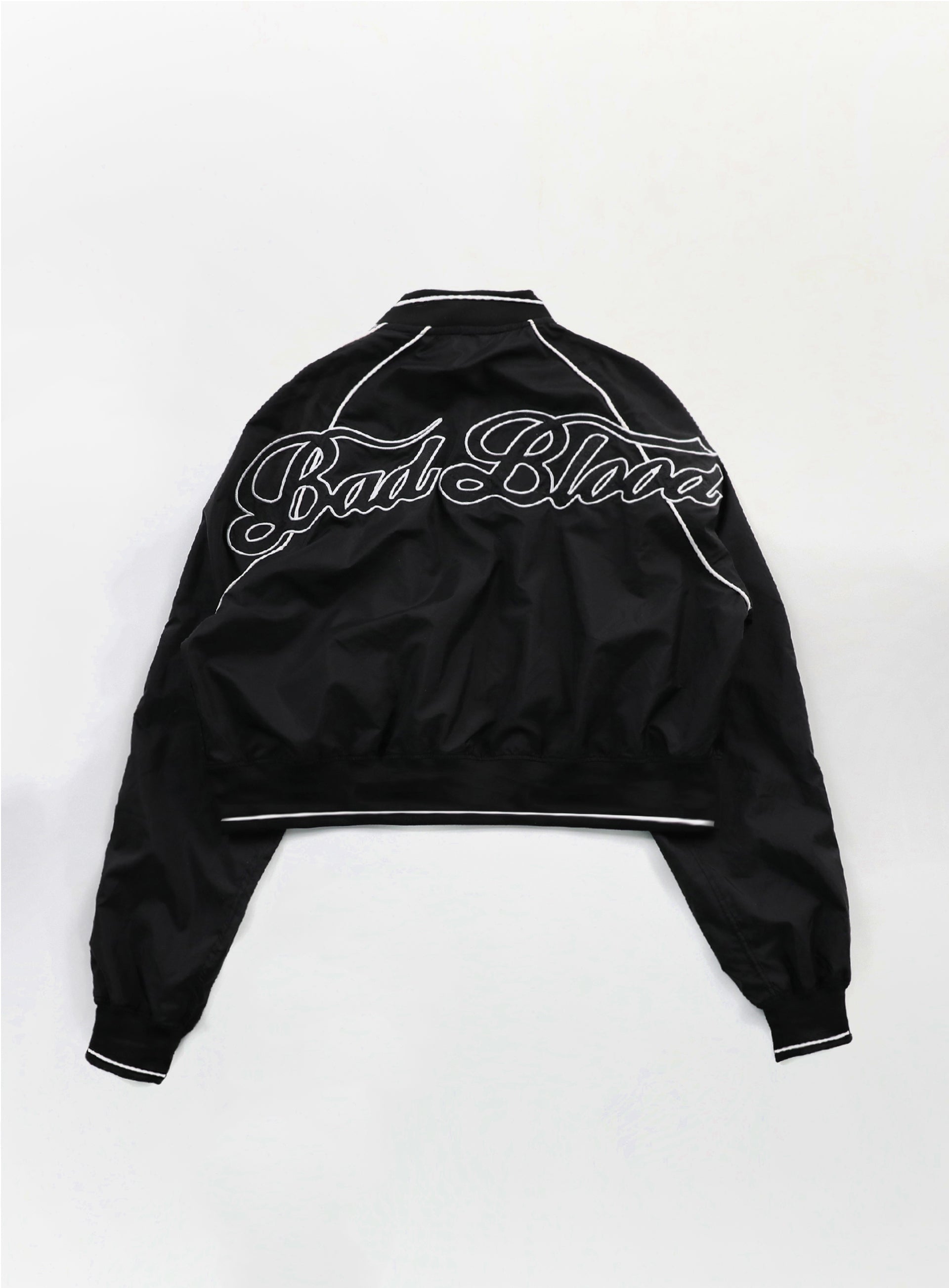 采用塔斯兰尼龙材质,轻便舒适,宽松版型。金属双向拉链。前面有Bad logo,后面有Badblood logo。颈部和下摆袖口采用罗纹收边处理。前面两侧有嵌袋口袋。侧边拼接双线和侧边透视特殊加工提高透气性。