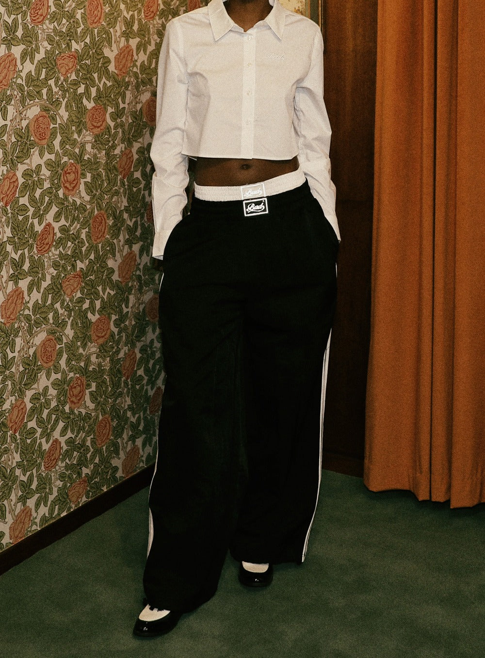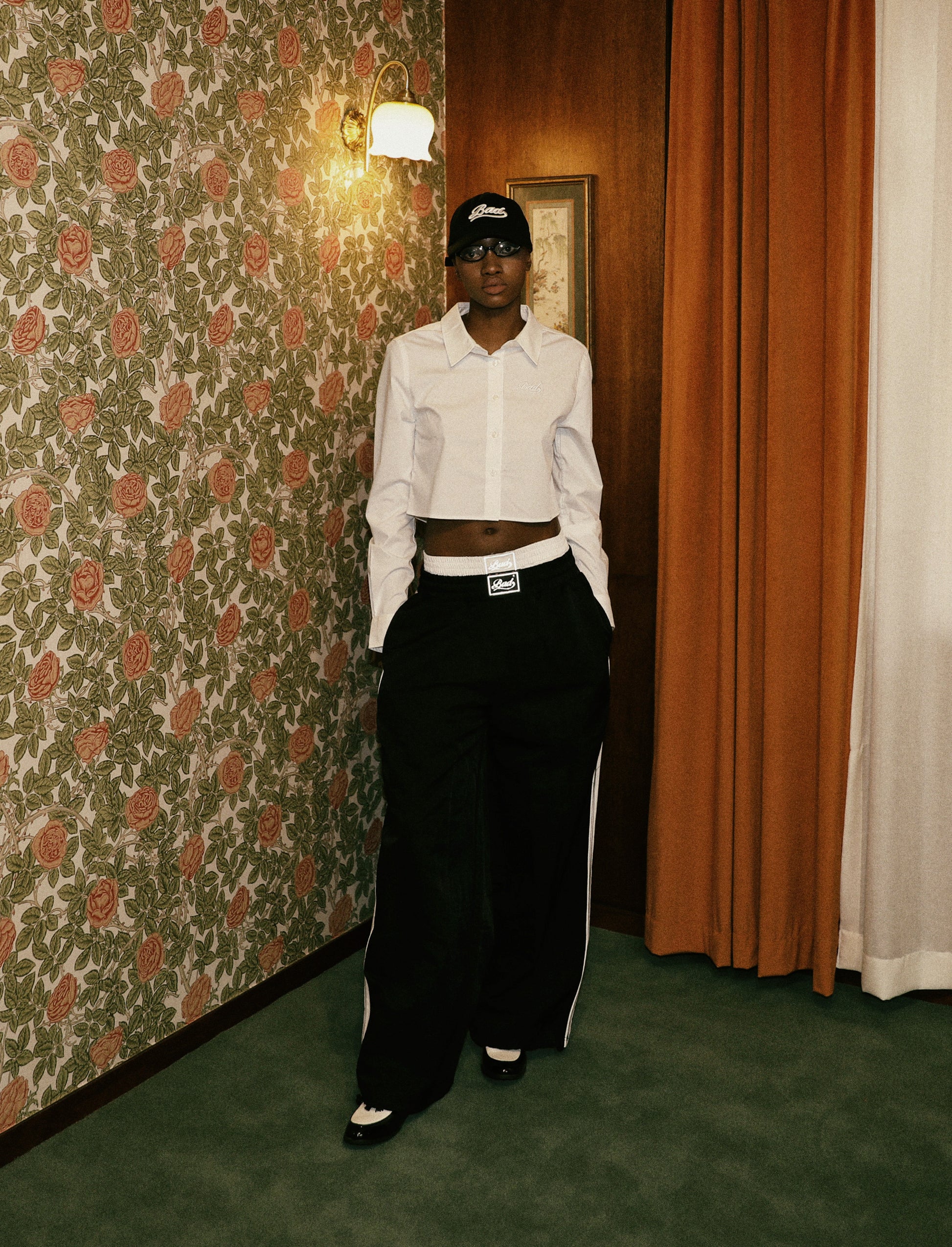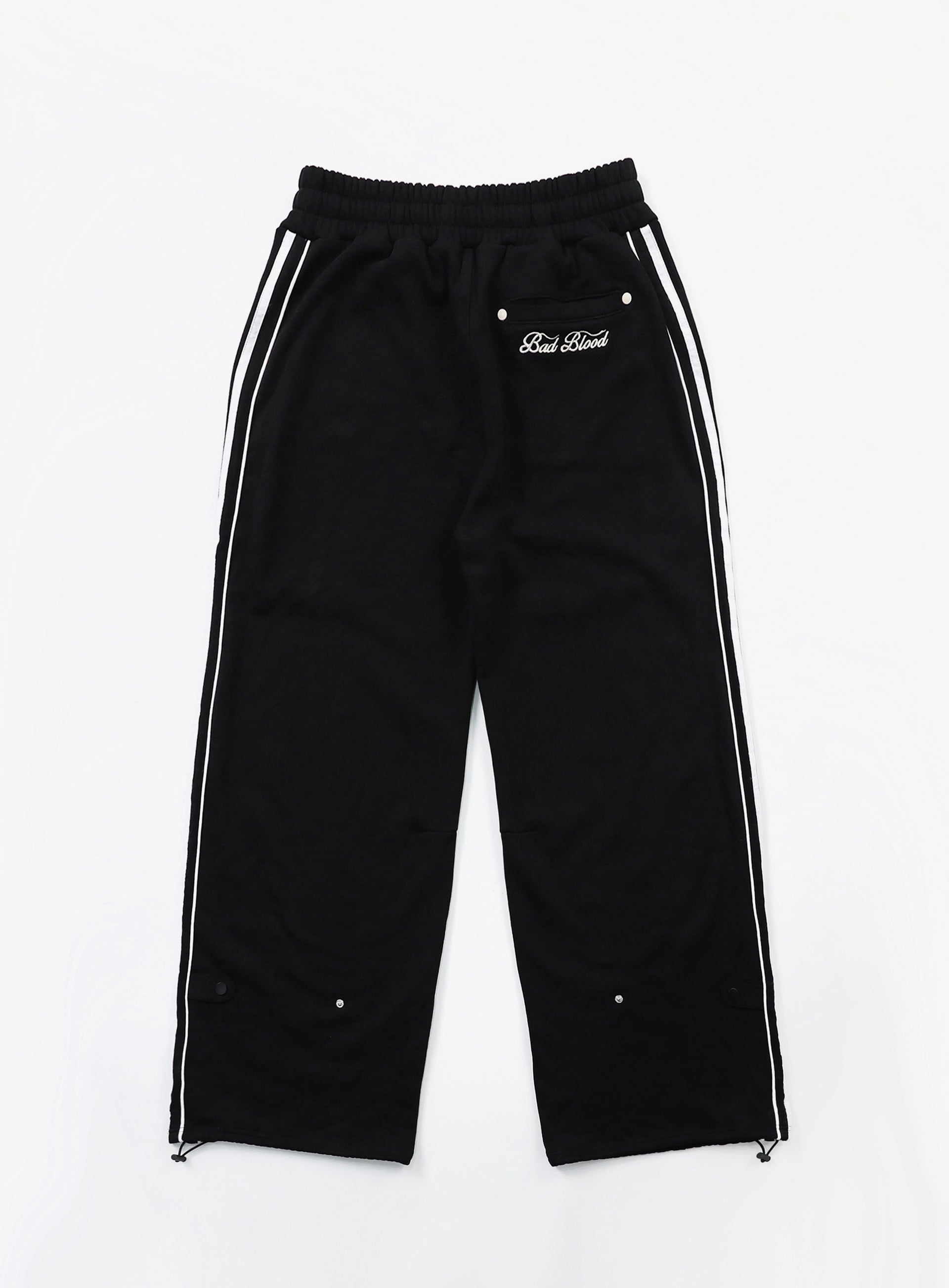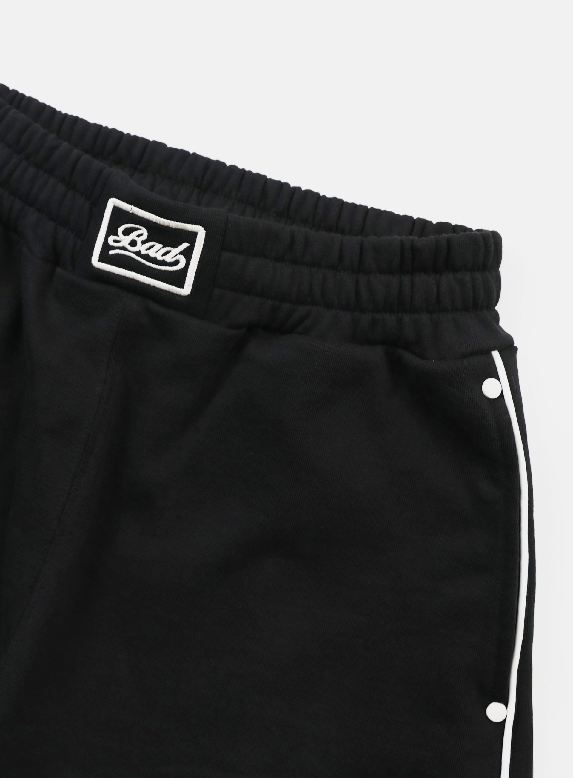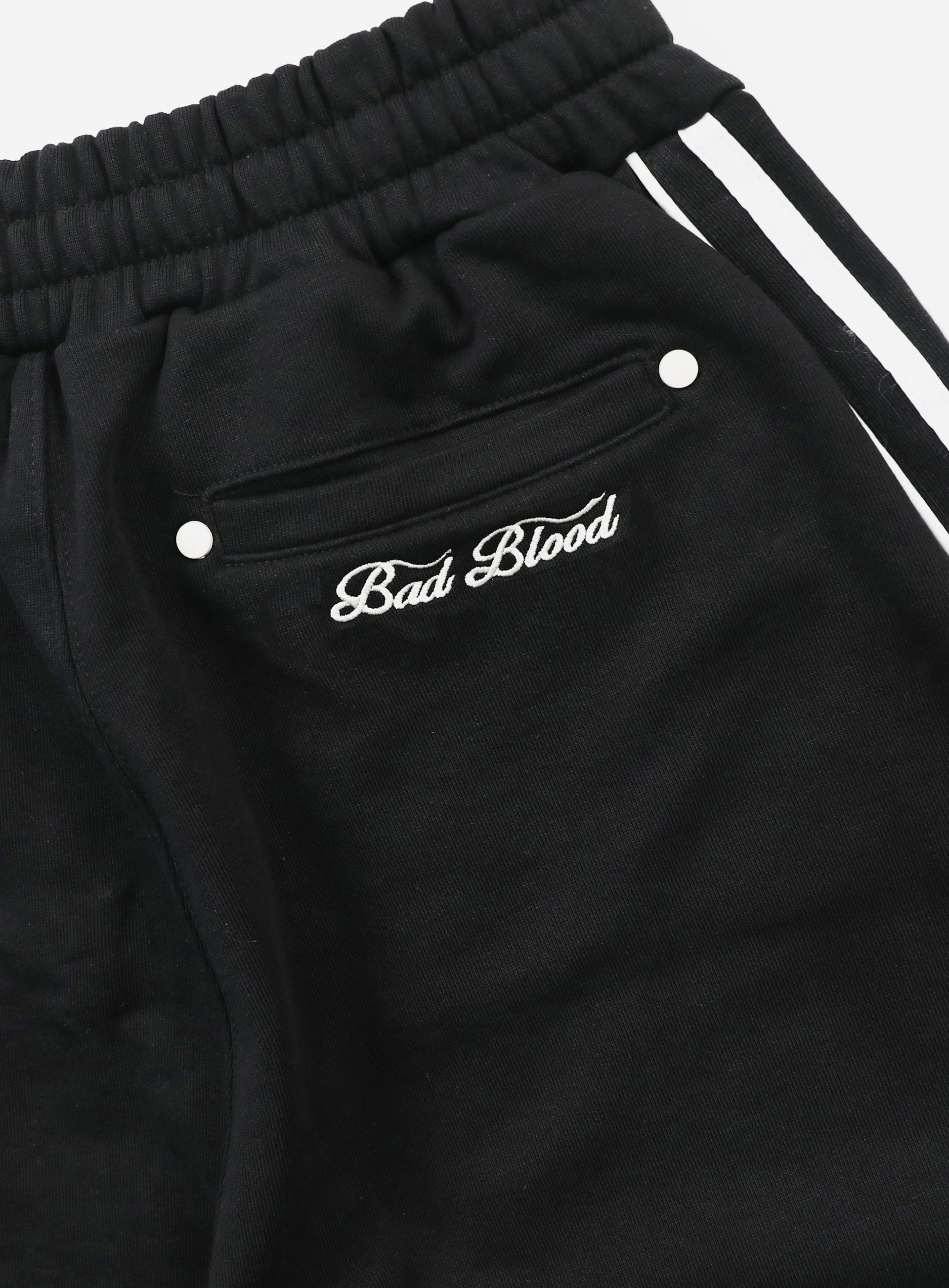 皮肤友好的有机棉制作的Billy 2 Way曲线 jogger裤,柔软的触感和舒适的穿着感。侧面对比色双线设计,白色铆钉装饰的侧面两个插袋和后面口袋。腰部中央印有Bad logo,腰线可翻转并通过Badblood logo和绳带展示。后口袋顶部印有Badblood logo,裤子后小腿部位配有可调节的按钮和裤脚绳带细节。