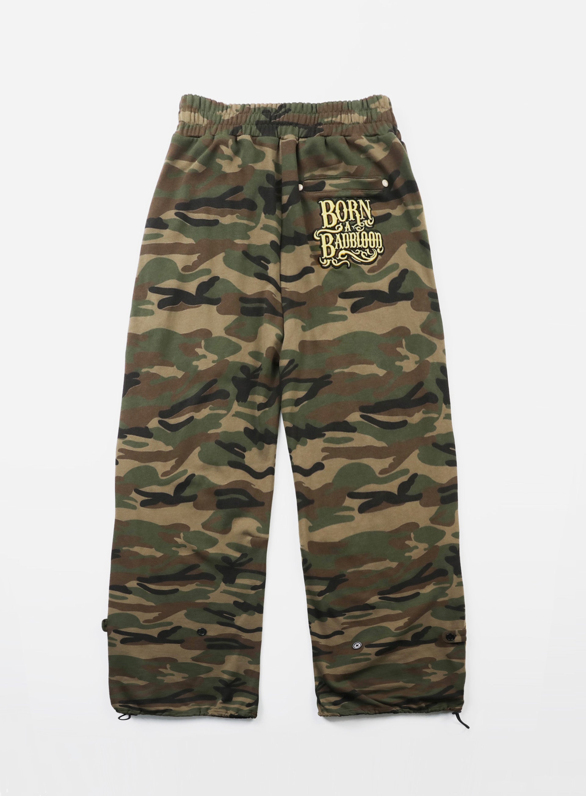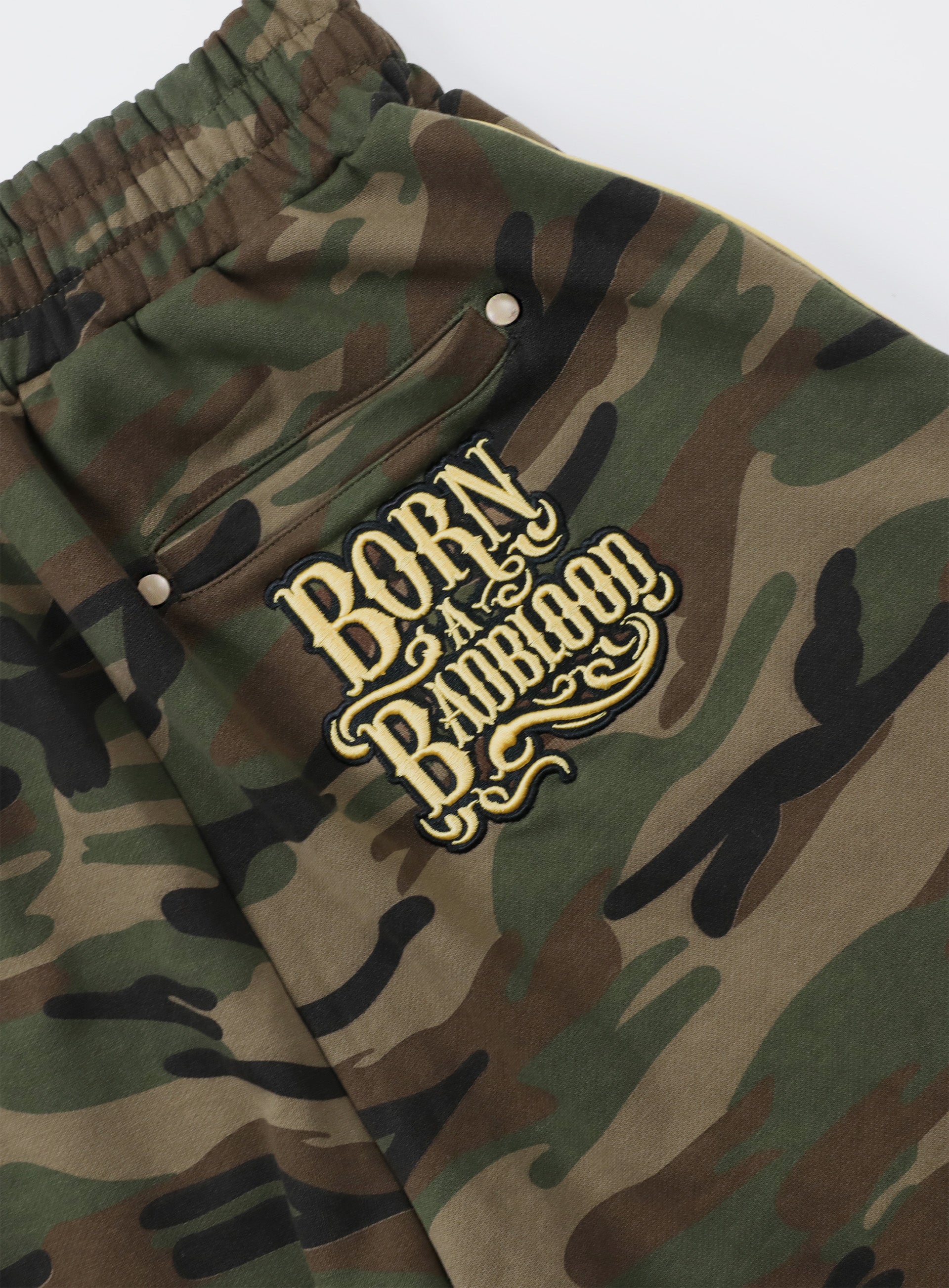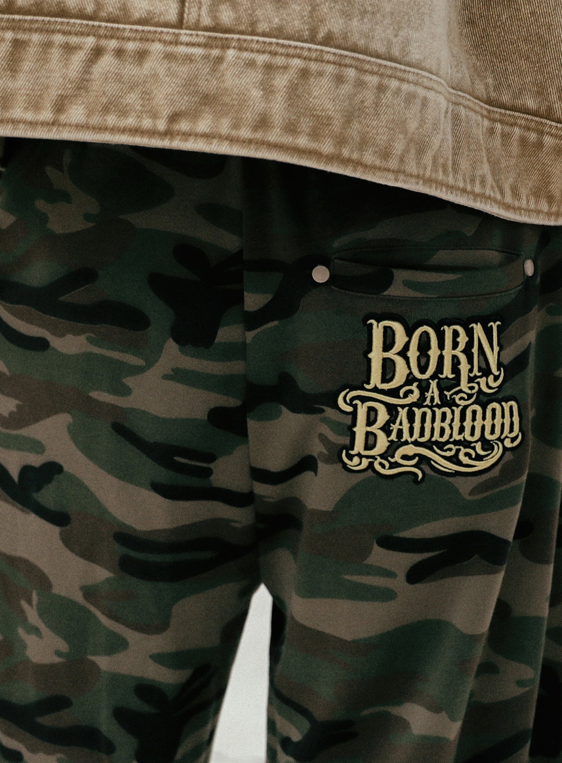 这款迷彩 2 Way 曲线 jogger 裤采用柔软的棉质面料,展现出军事风格。配有铆钉装饰的两侧插袋和后方的口袋,原材料制成的带子与腰带环设计。内部的松紧腰带上印有 Badblood logo,且腰带可翻转为低腰款式。裤脚有绳带设计。前中 Bad 的浮雕 logo 和后方 BORN A BADBLOOD 的浮雕贴片增加了细节。