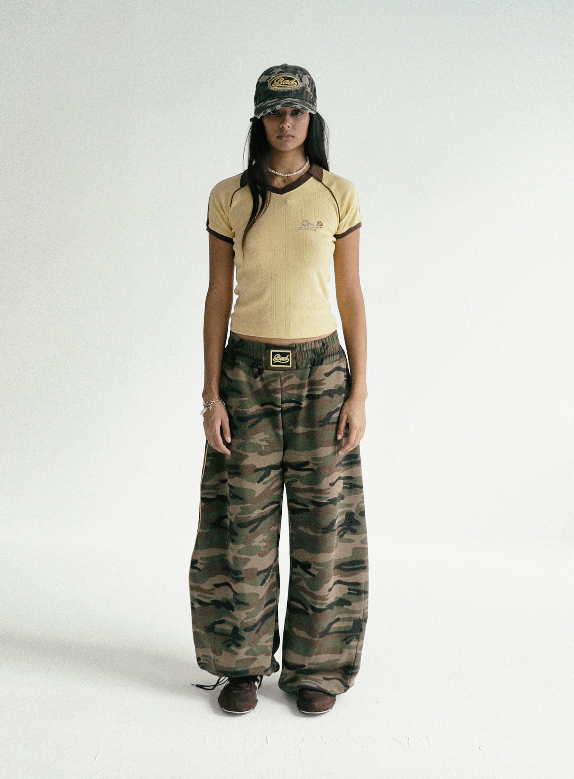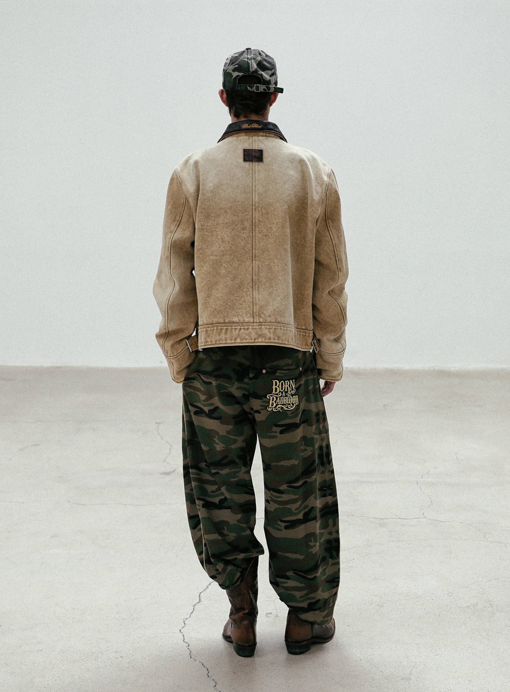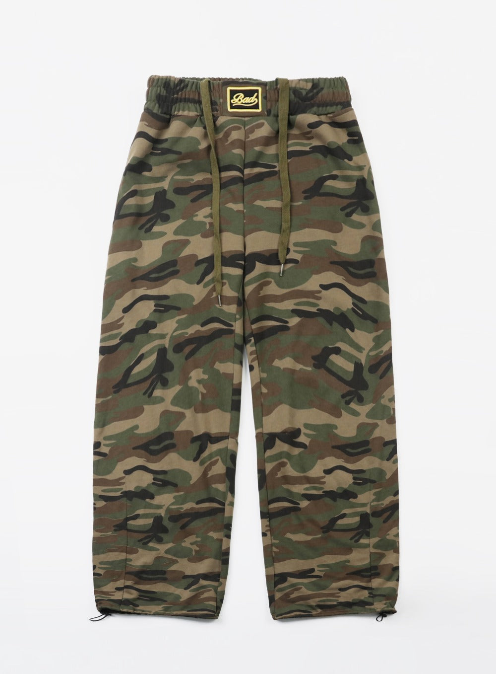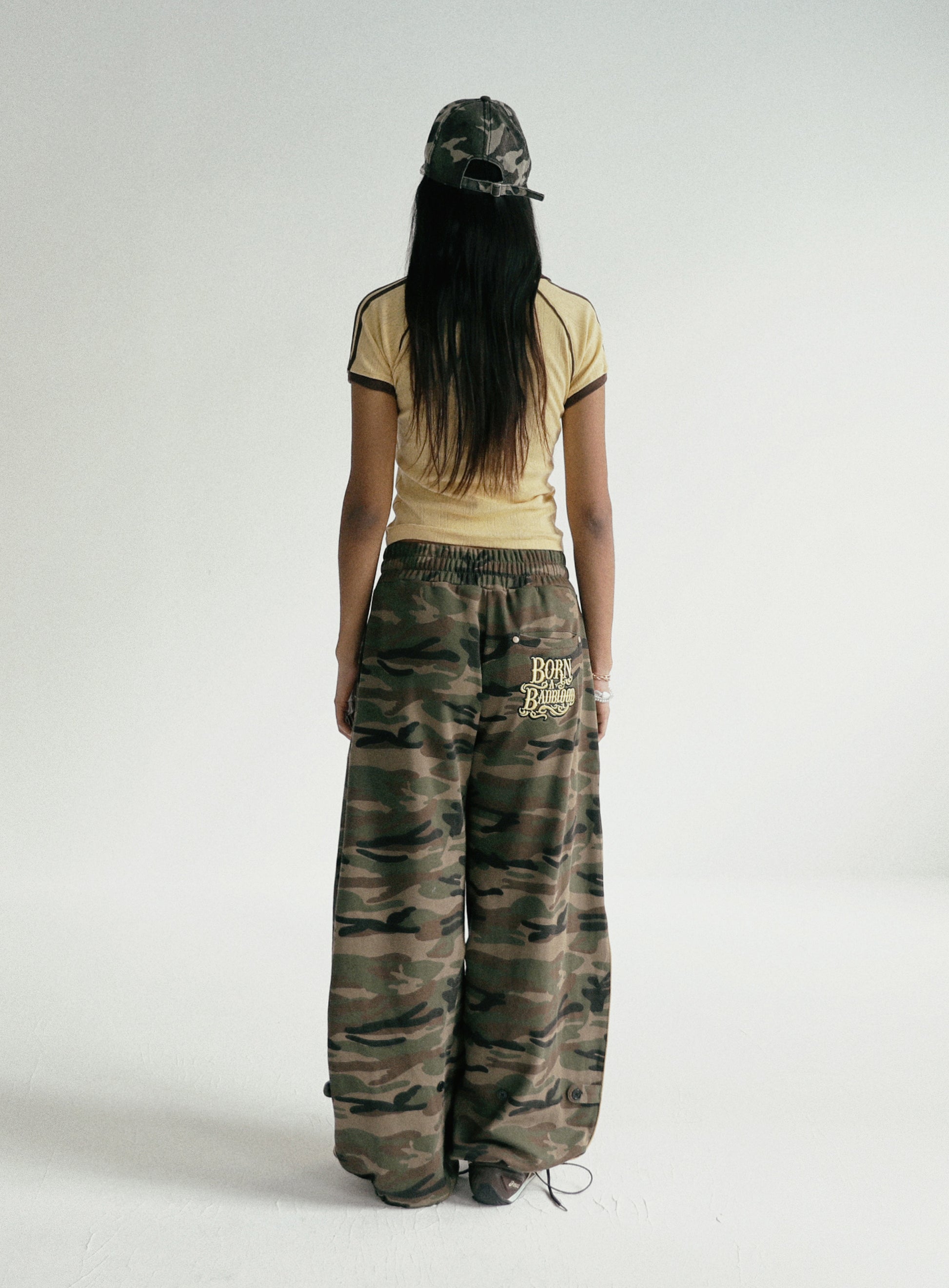 这款迷彩 2 Way 曲线 jogger 裤采用柔软的棉质面料,展现出军事风格。配有铆钉装饰的两侧插袋和后方的口袋,原材料制成的带子与腰带环设计。内部的松紧腰带上印有 Badblood logo,且腰带可翻转为低腰款式。裤脚有绳带设计。前中 Bad 的浮雕 logo 和后方 BORN A BADBLOOD 的浮雕贴片增加了细节。