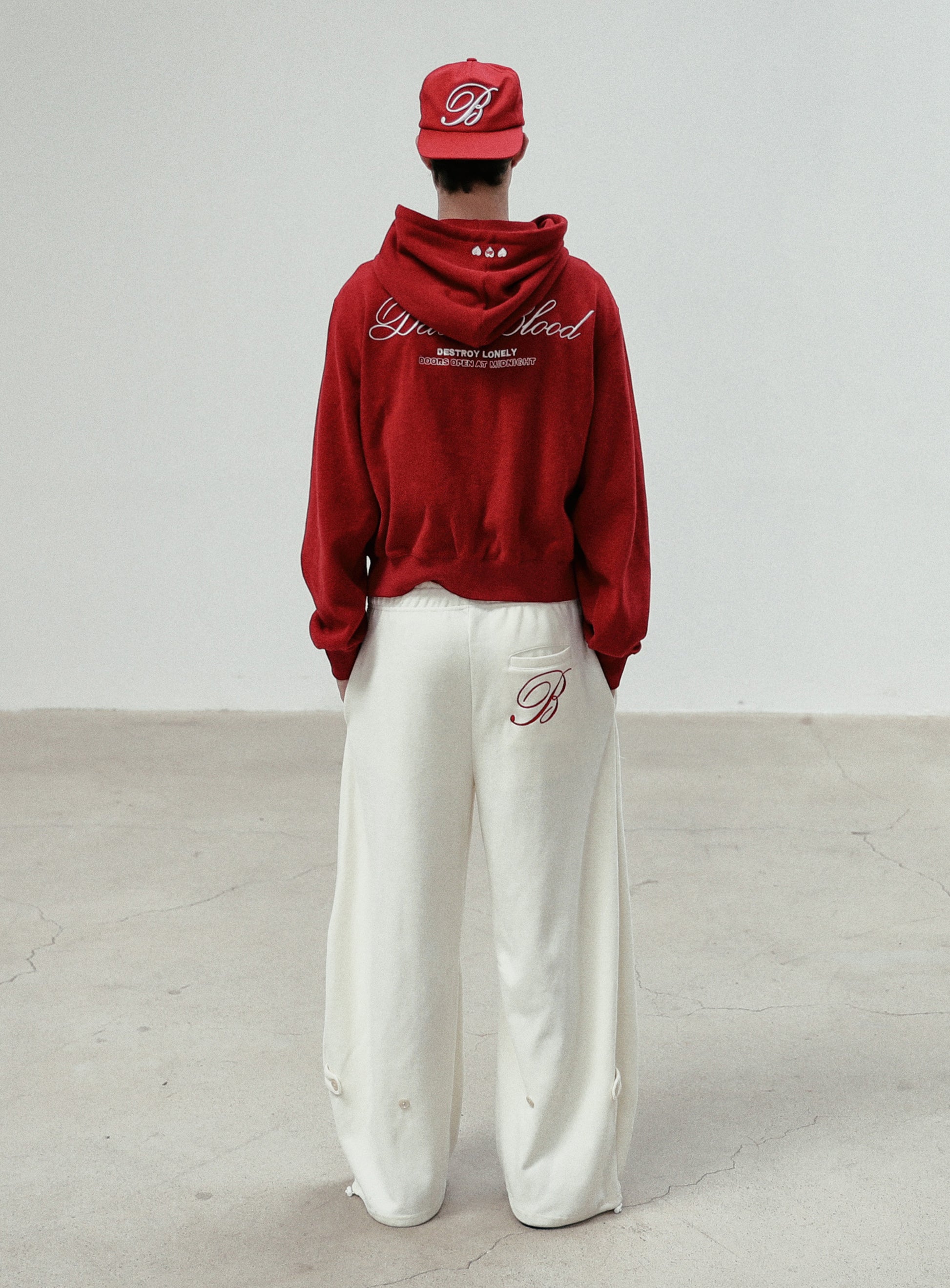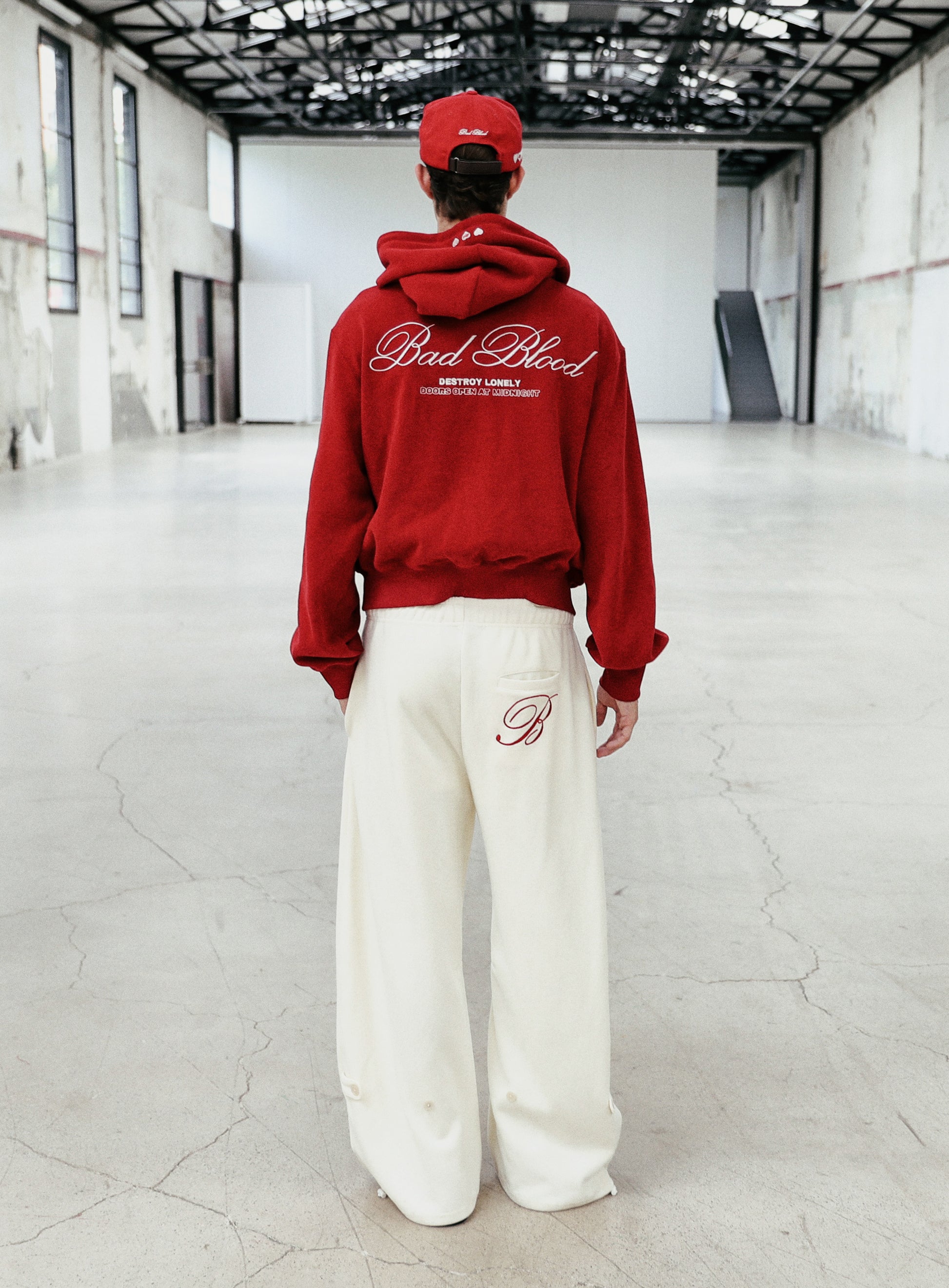 这款经典徽标 2 Way 弧形慢跑裤采用柔软的棉混合毛圈面料,提供舒适的穿着感。配有铆钉装饰的两侧插袋和后方口袋,以及松紧腰带和带子。裤脚配有可调节的绳带和后方扣子设计。前面印有 Badblood 的脚本 logo,后方口袋上有经典的 B logo。