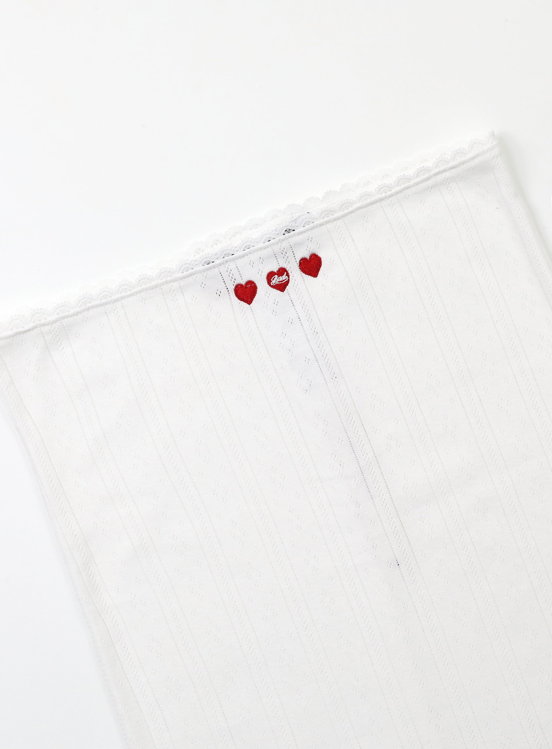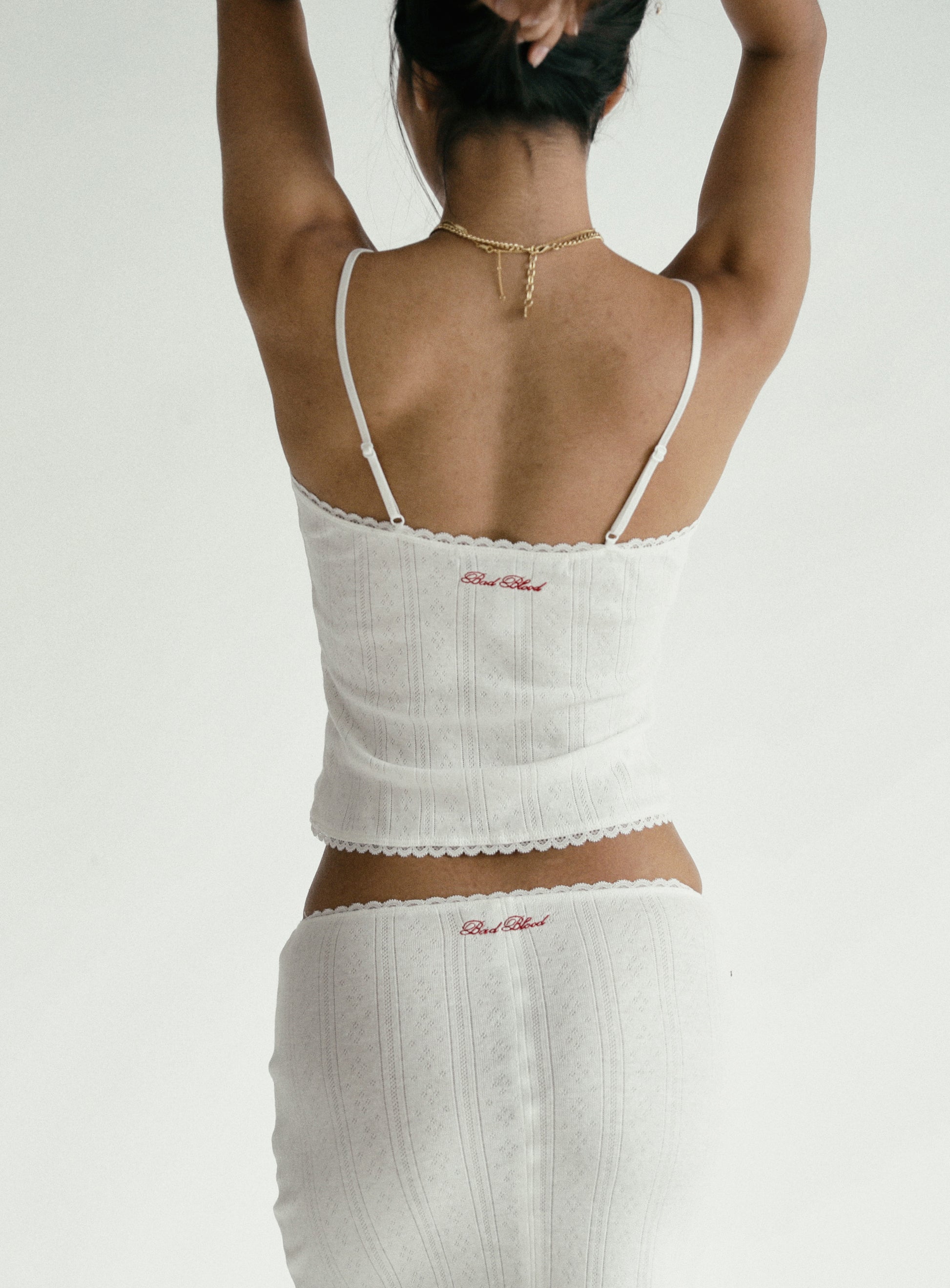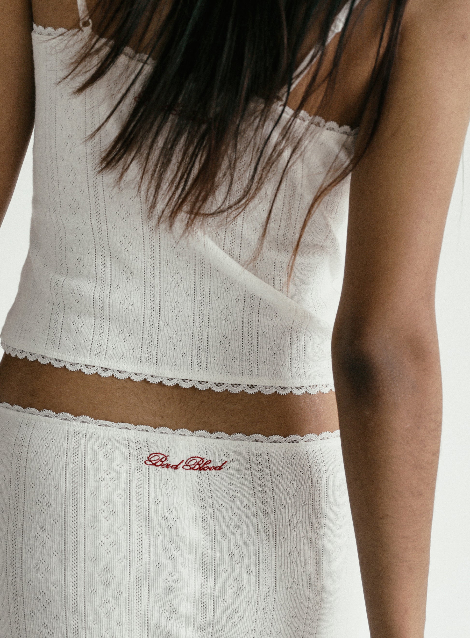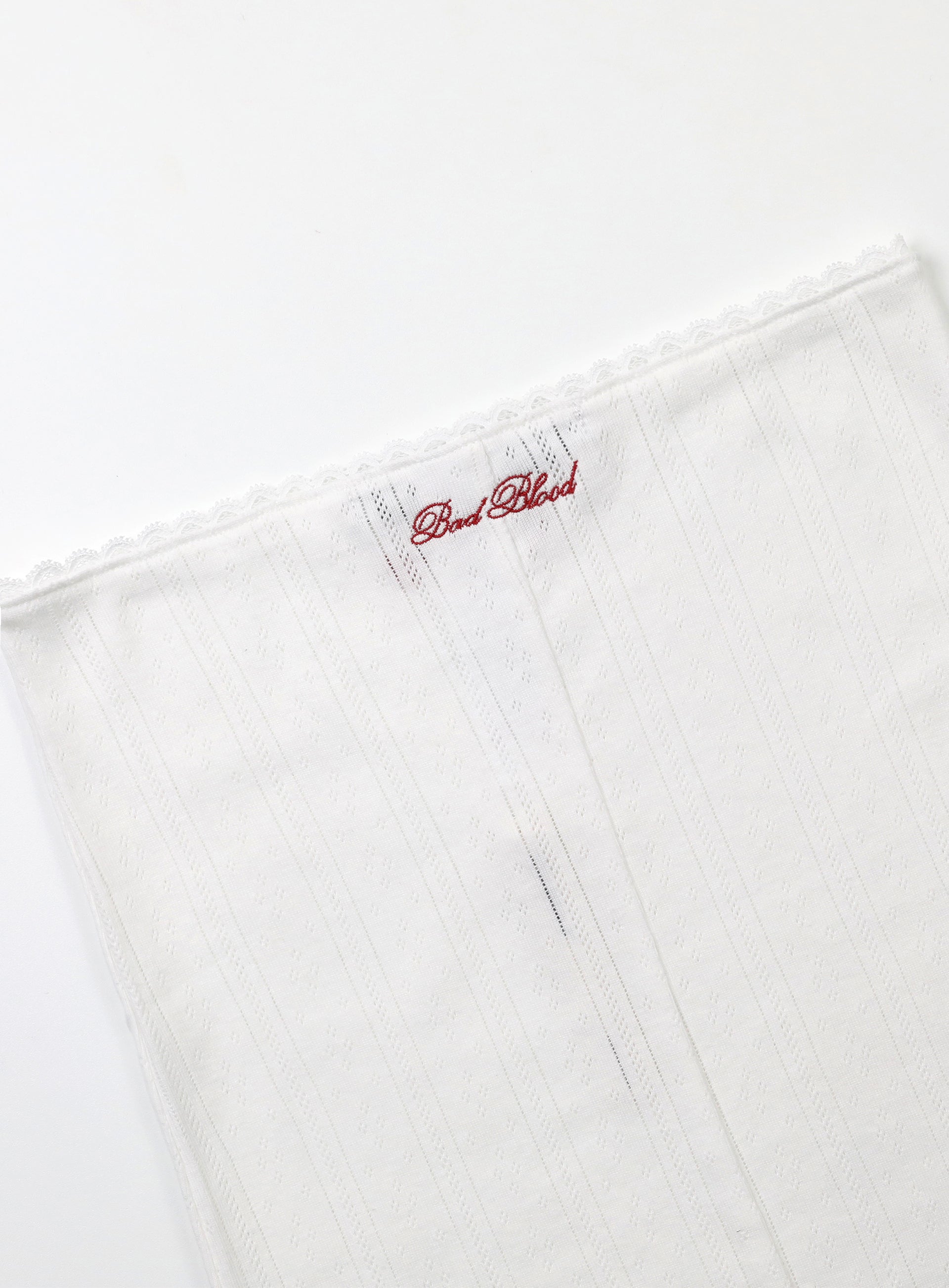 这款经典徽标中长裙采用100%棉纱针织面料,舒适且透气,前中央有 Bad 心形刺绣细节,背面上部饰有 Badblood 字样标志,裙边有蕾丝装饰,后摆开衩设计。