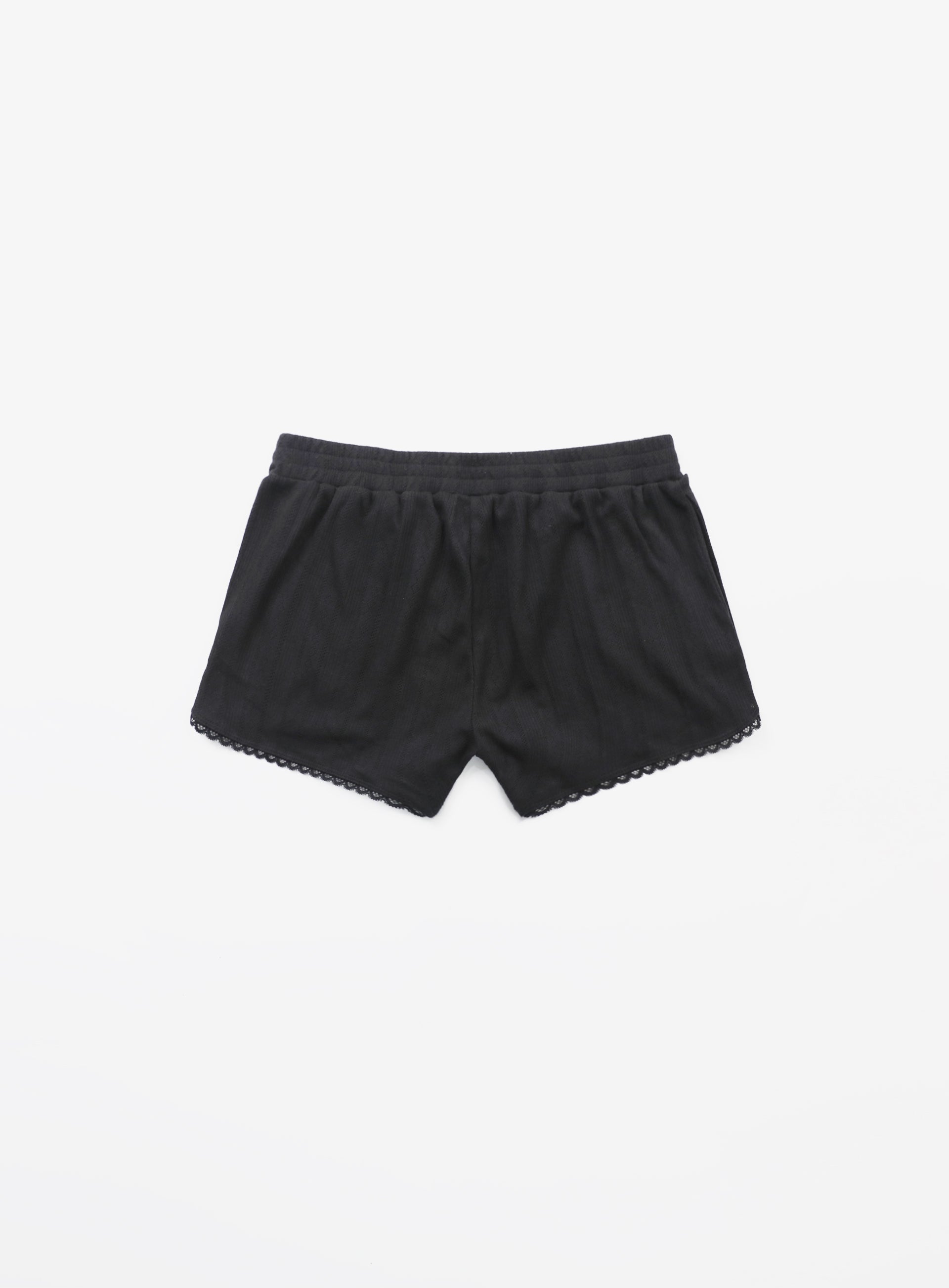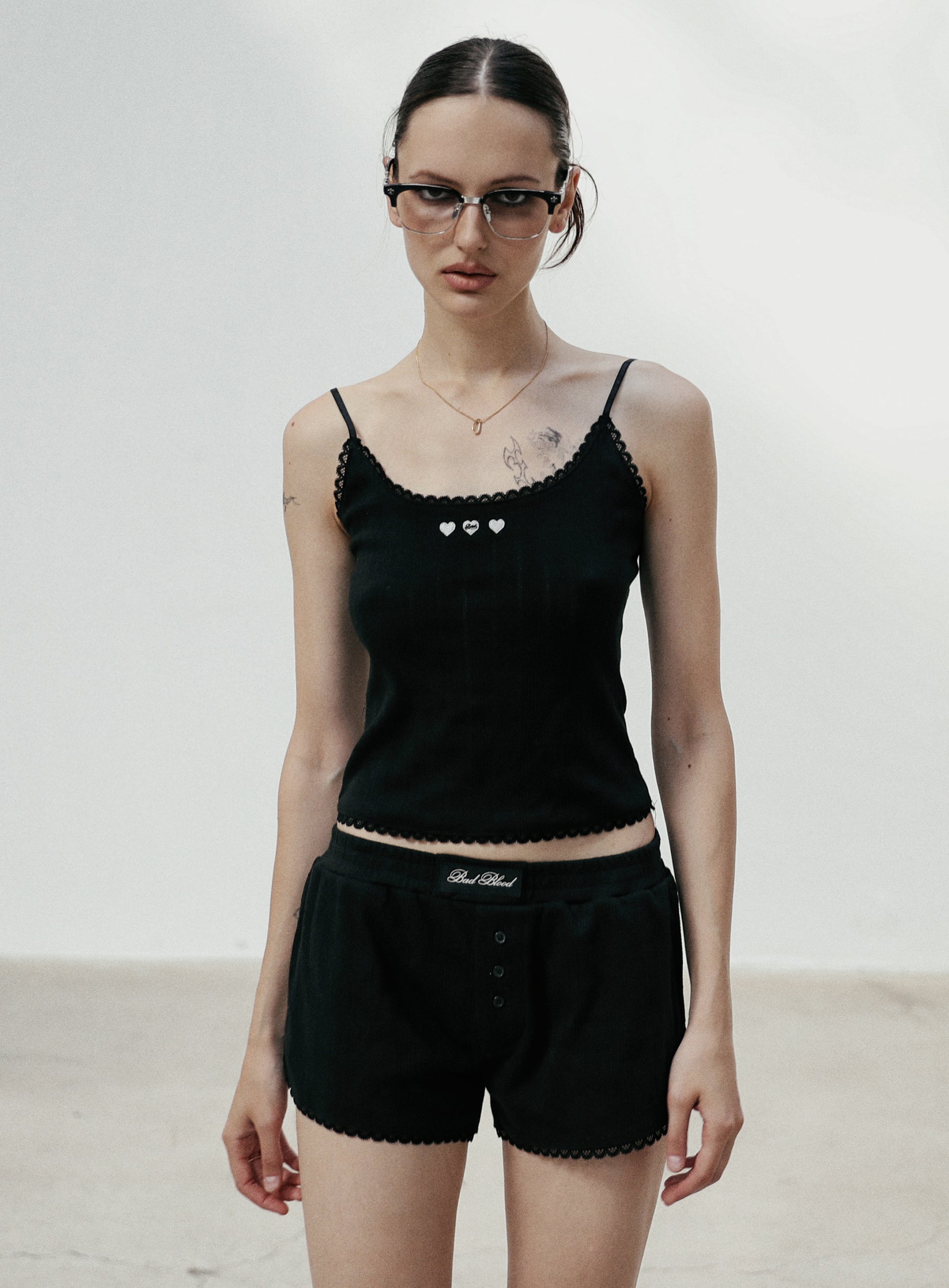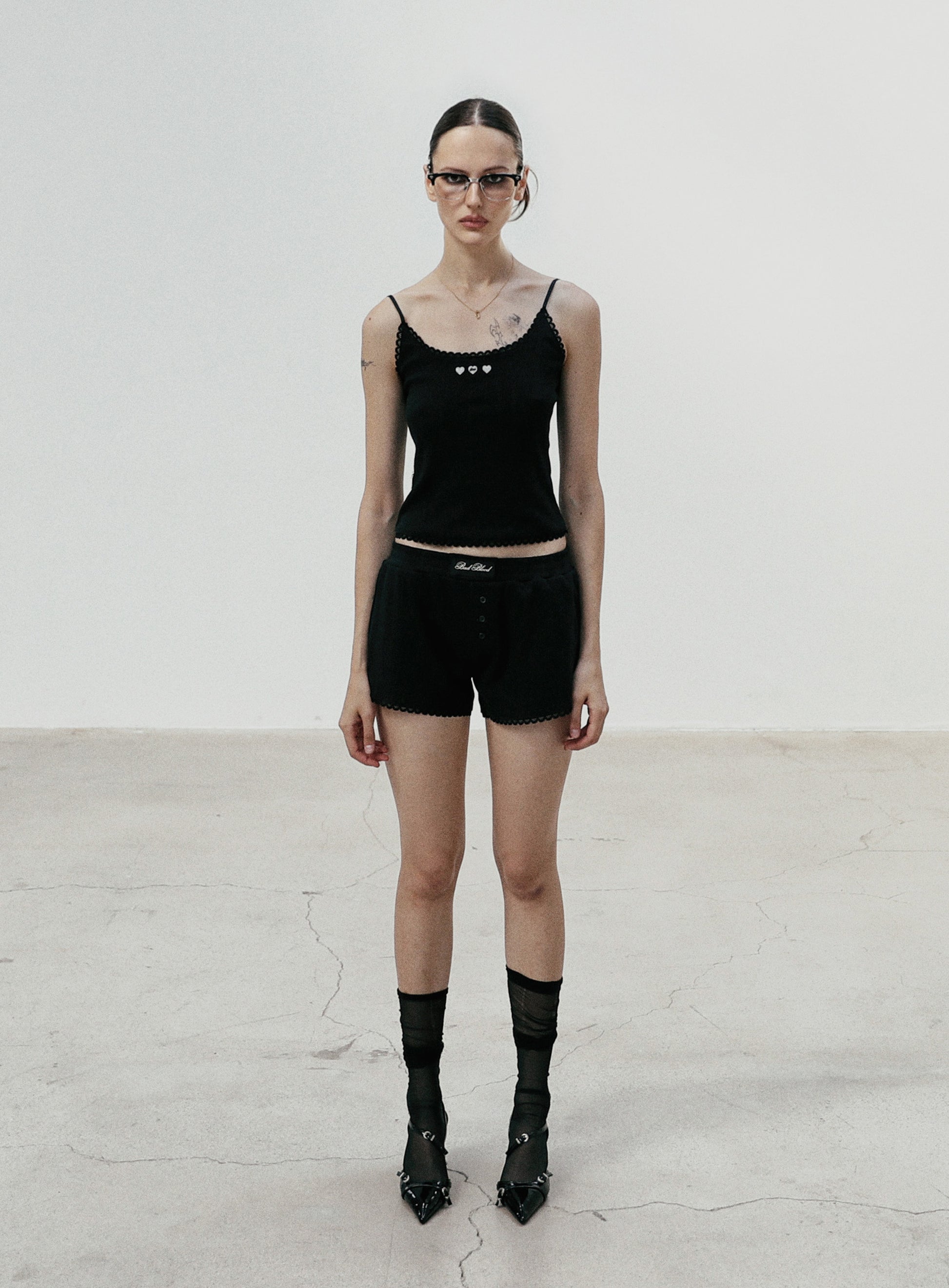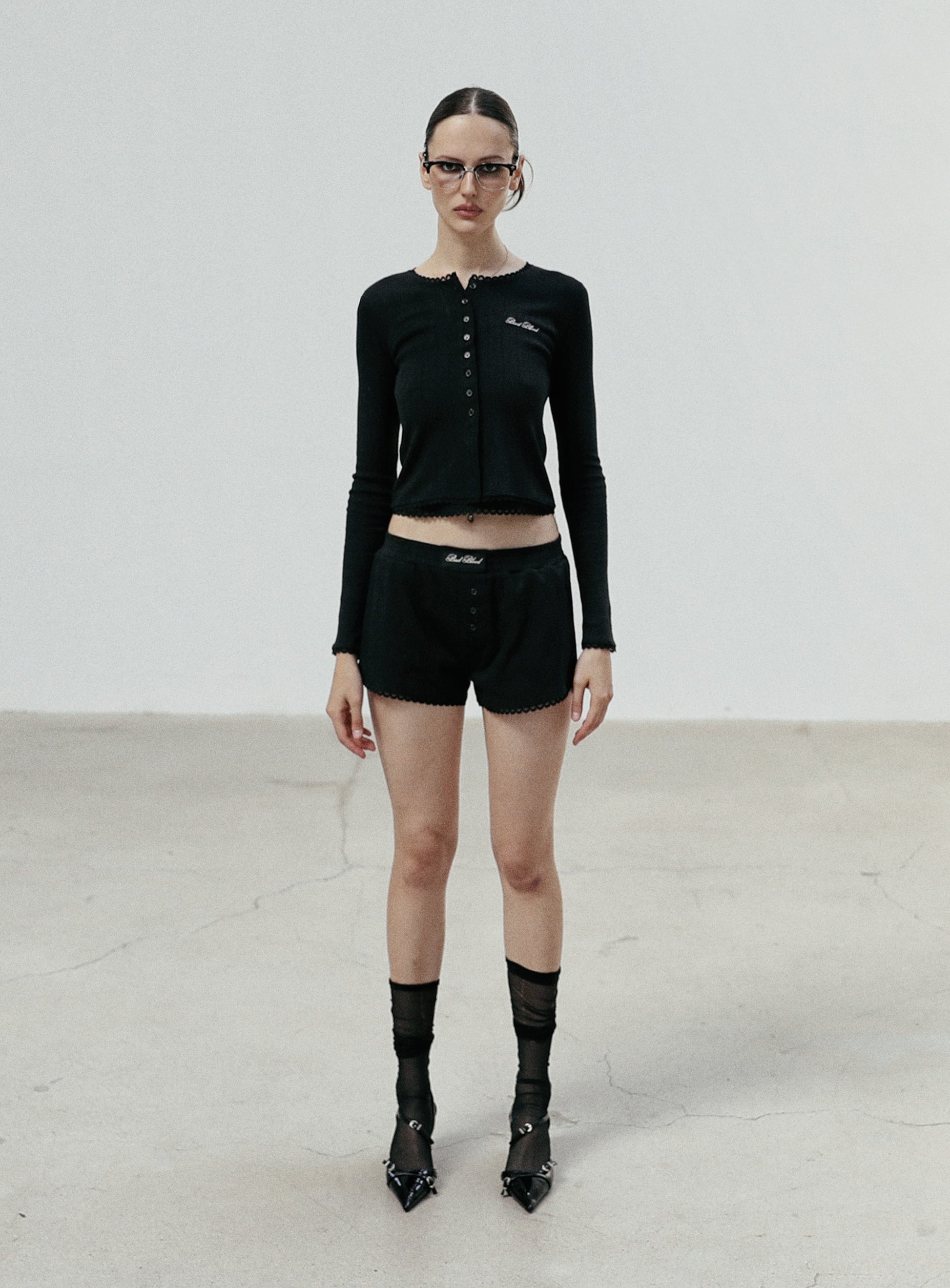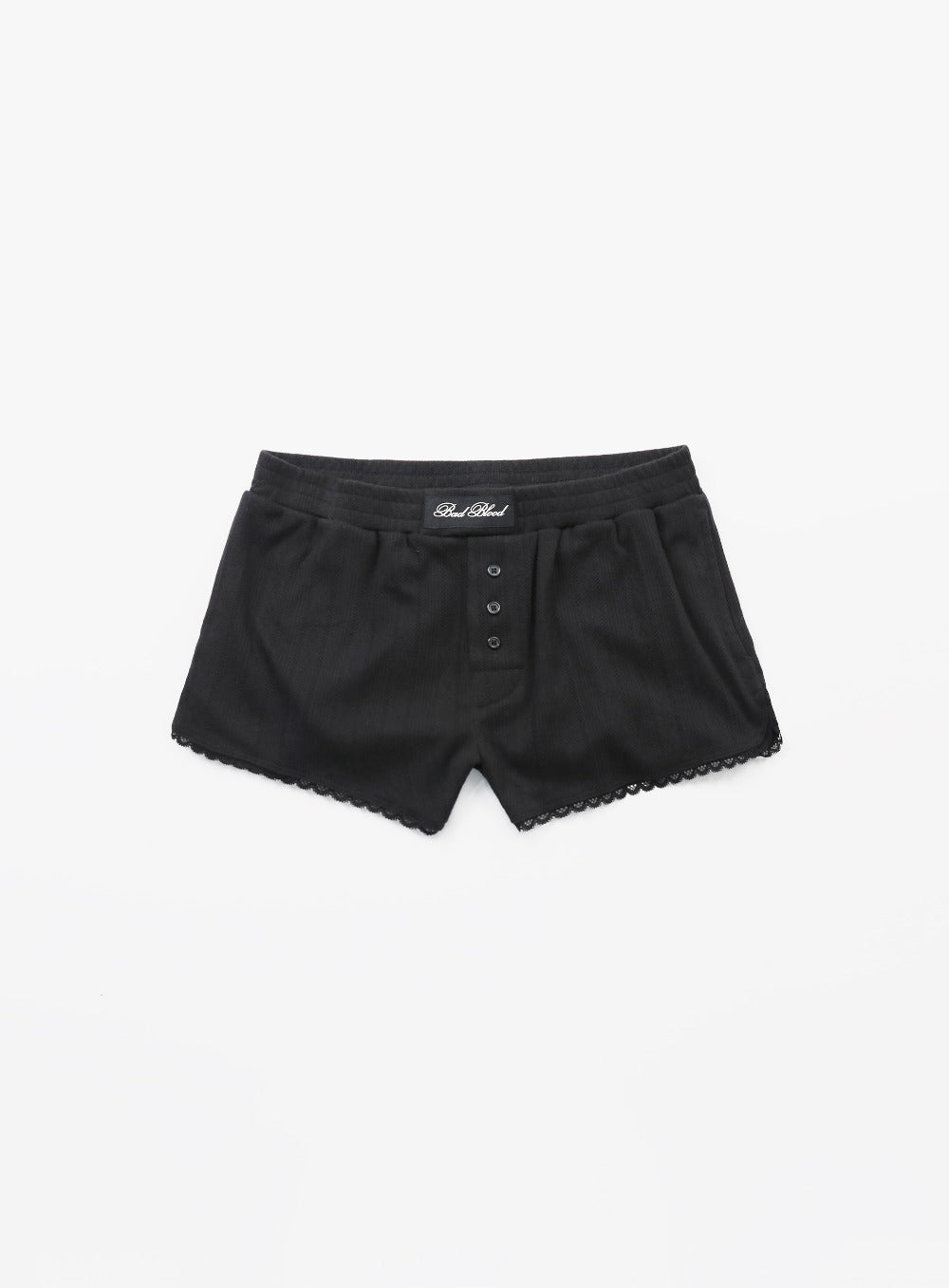采用100%棉纱针织面料制作的微型短款拳击裤,轻盈贴身。侧面有两处内缝口袋和弧形开衩设计,蕾丝饰边收口。前腰部有松紧带和微型短裤标志贴片,松紧带内侧有Badblood标志贴片。