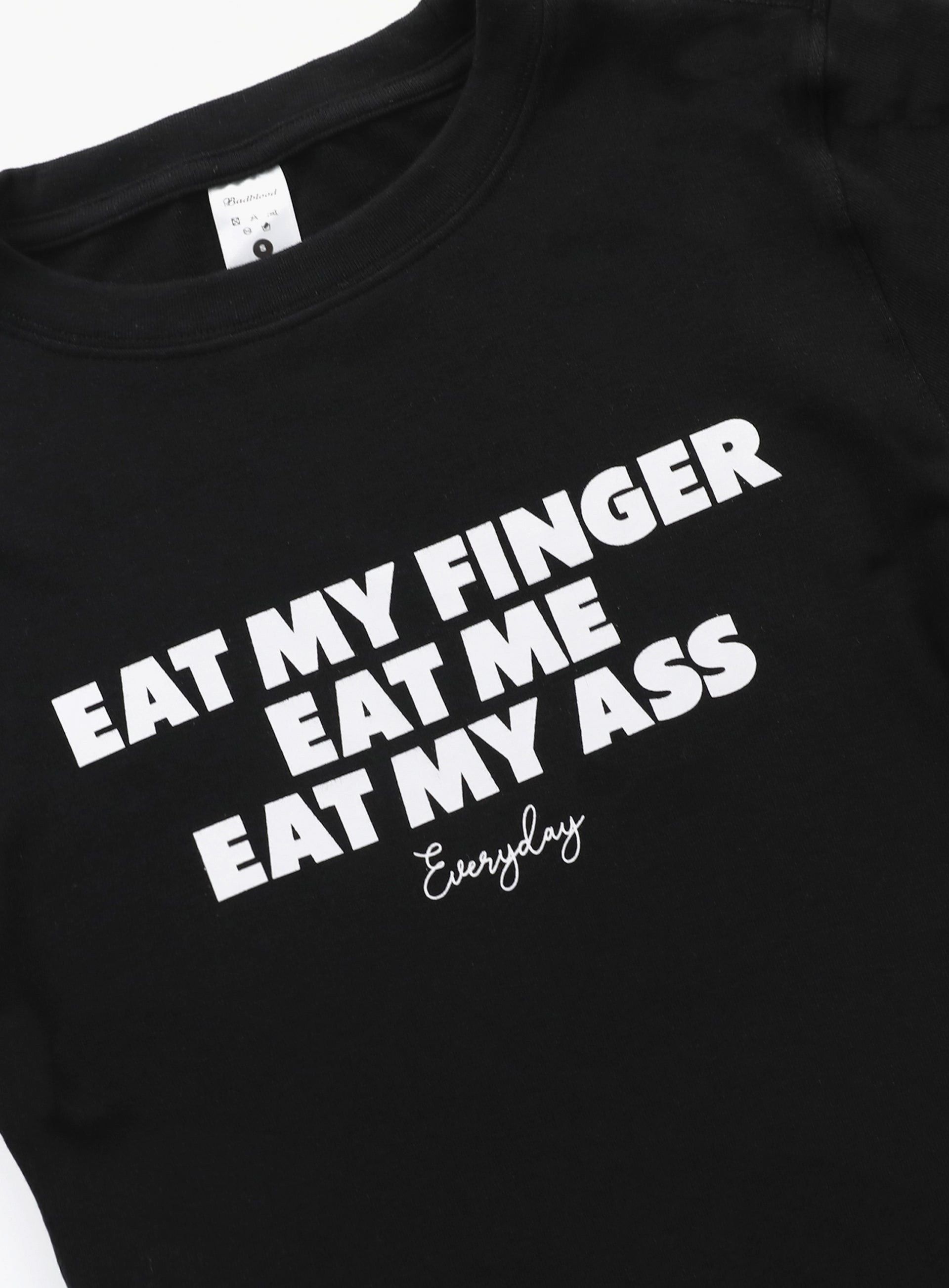 - 正面 "Eat Me" 粗体印花和手写字体字母印花