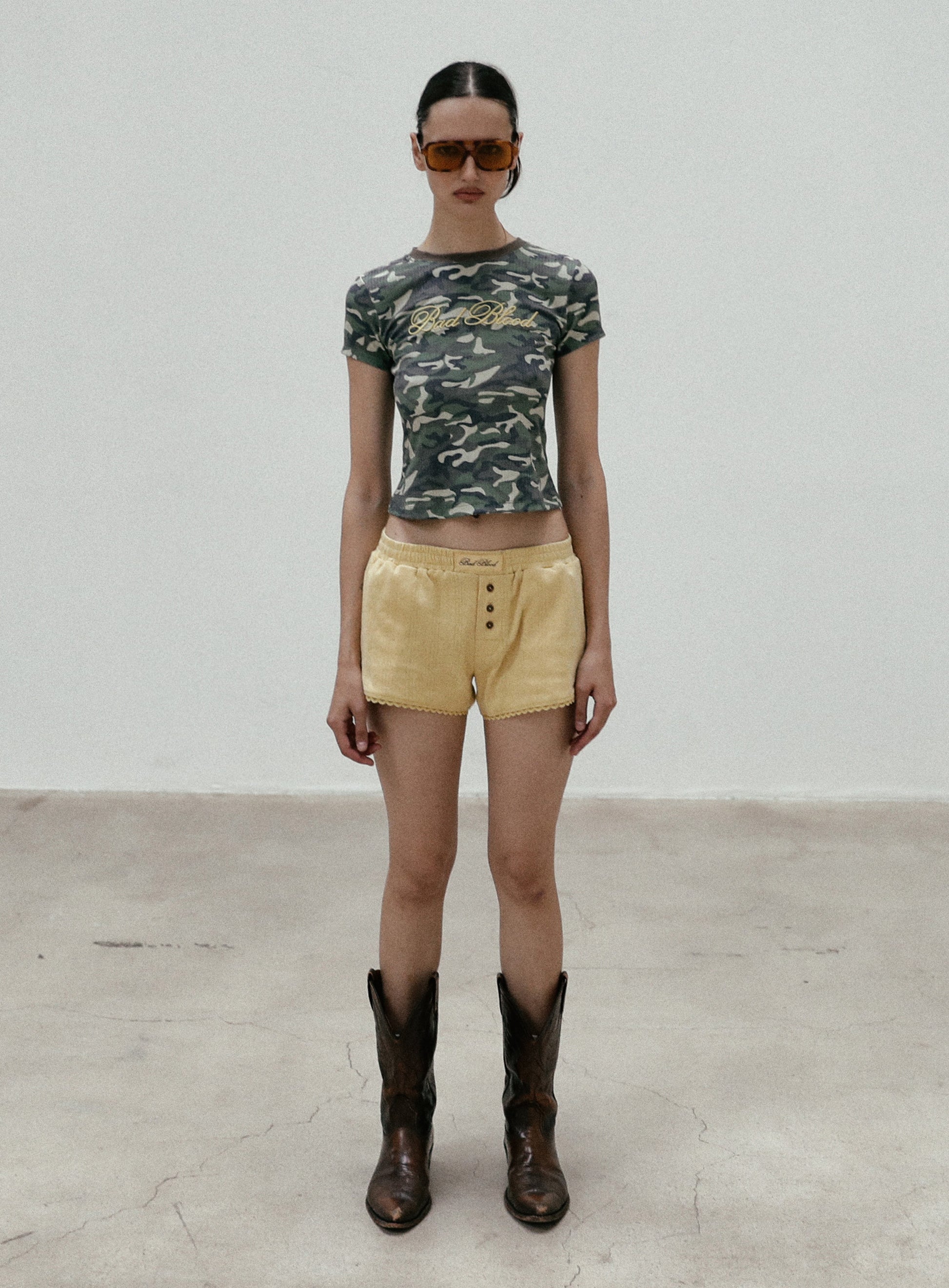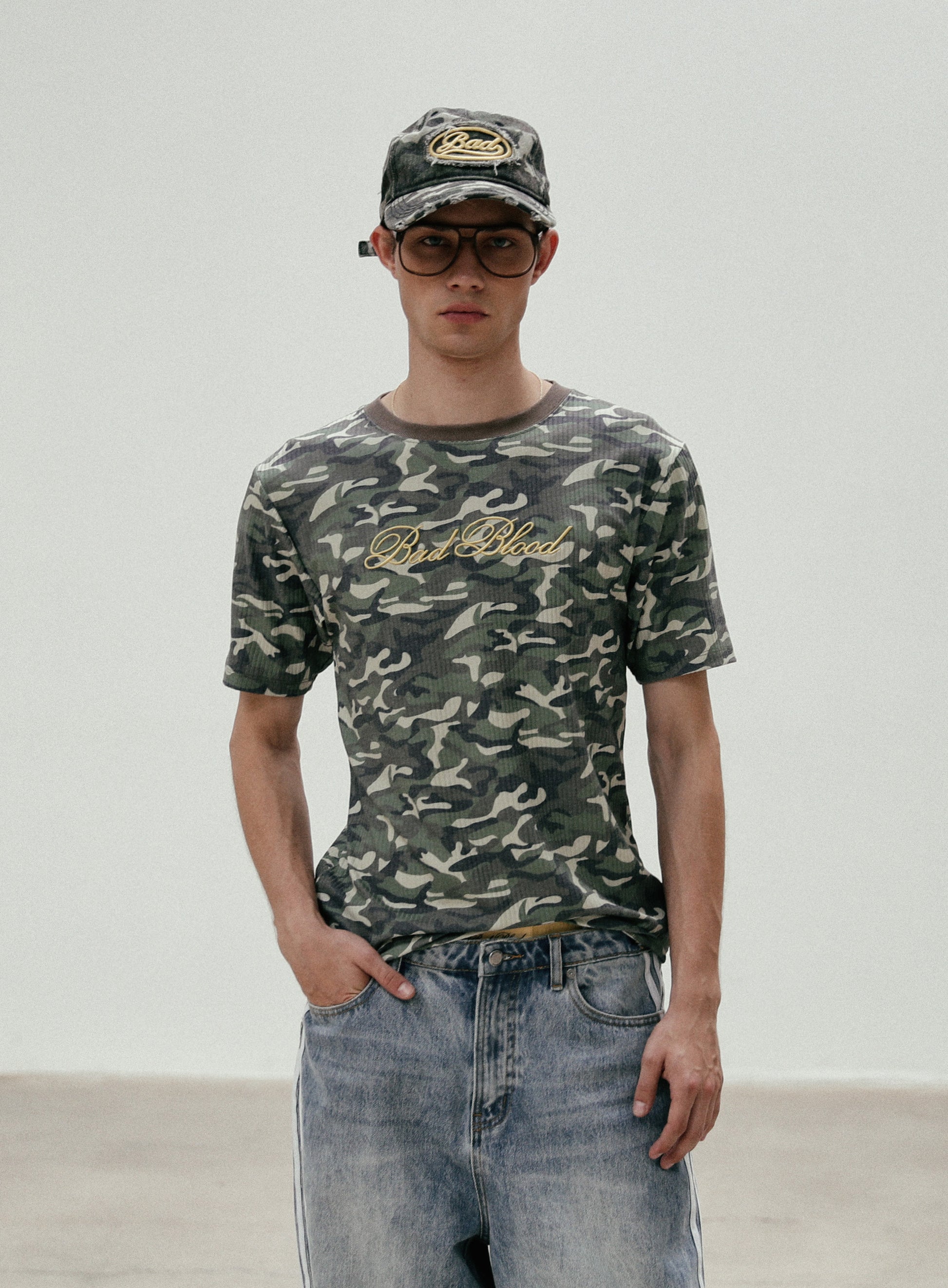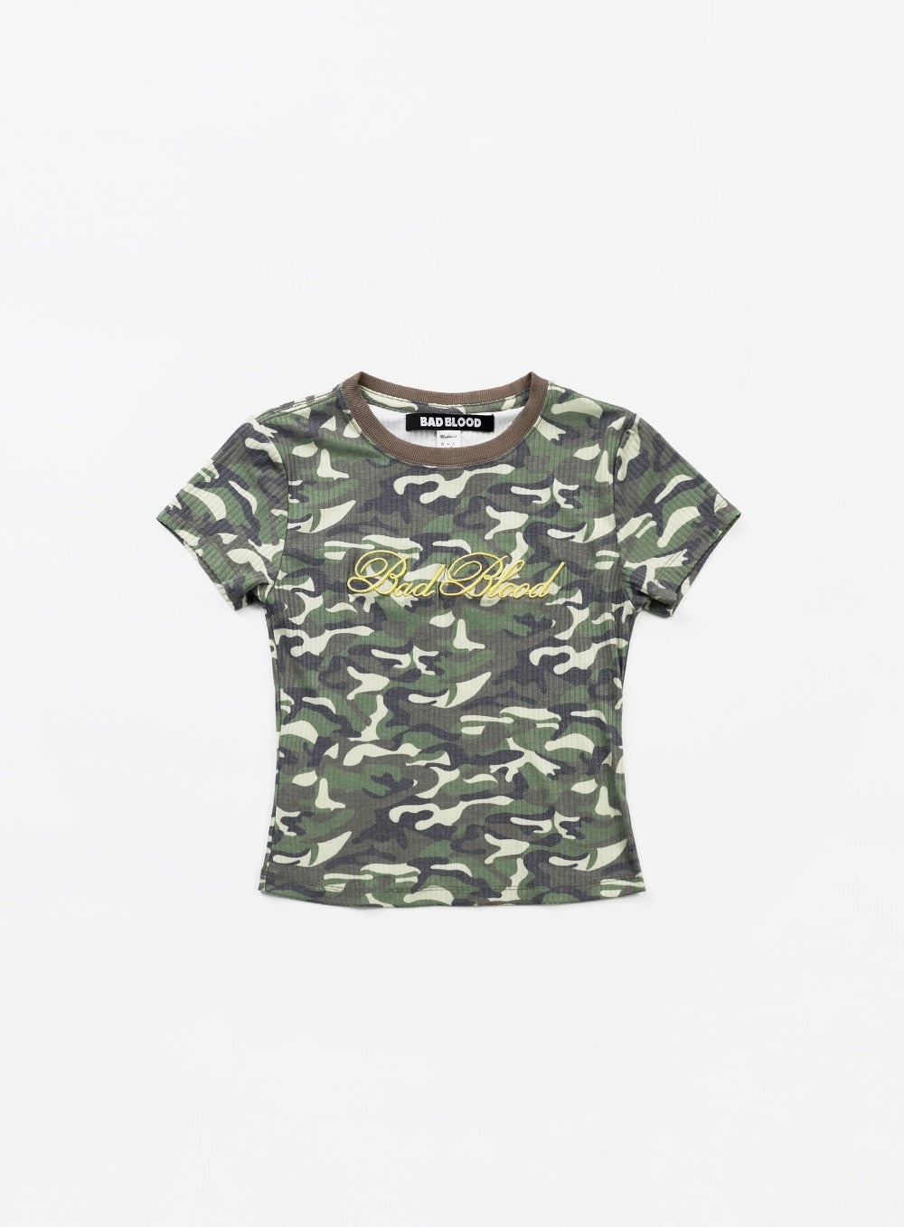 这款迷彩短袖紧身T恤采用弹性混纺罗纹面料,展现卓越的伸展性与修身设计。军装风格的领口配色与罗纹装饰。前面饰有 Badblood 脚本风格标志,背面上方为 Bad 菱形标志标签。