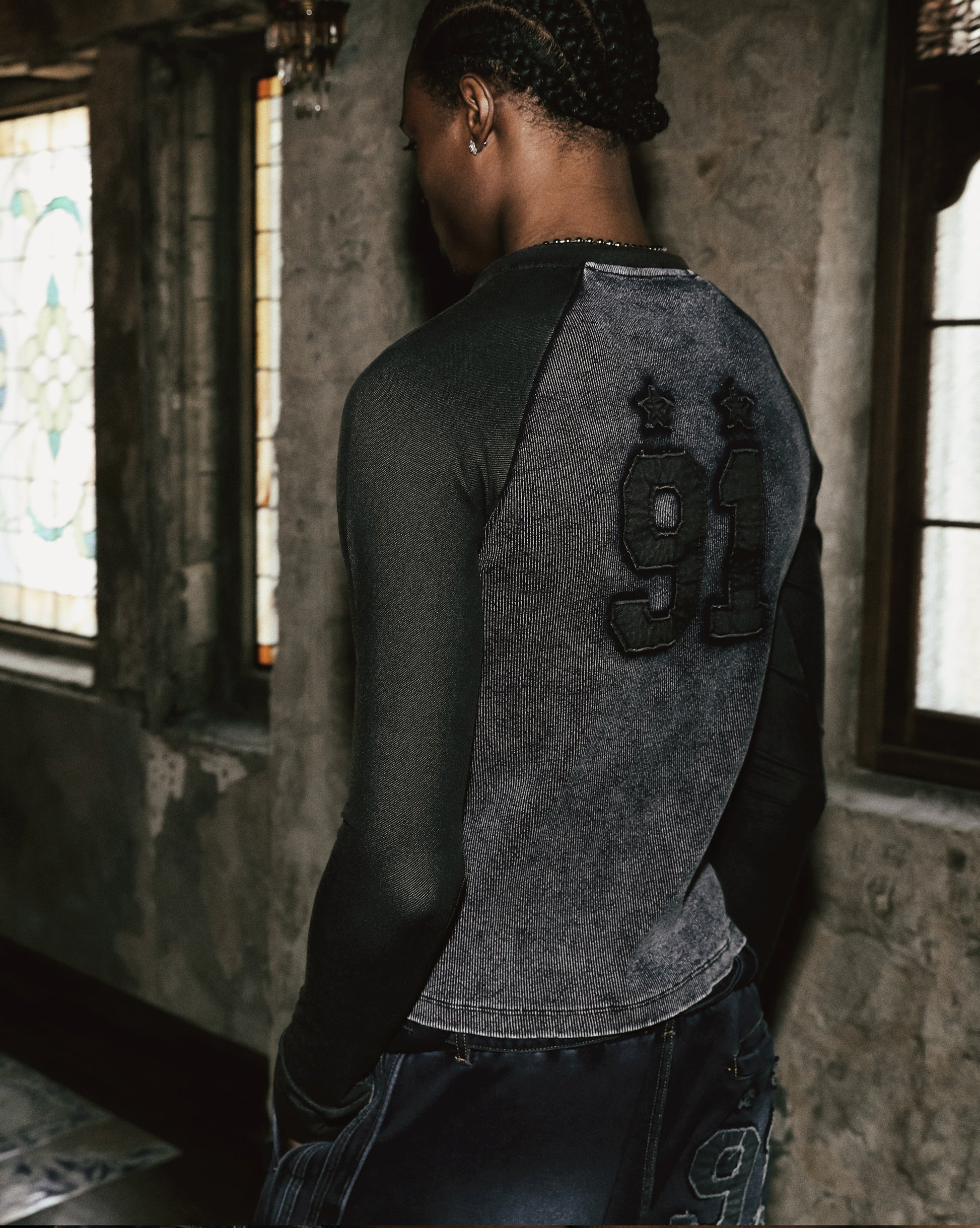 这款采用盐洗处理的棉质面料制作,展现出复古的牛仔色调的“Rusty Denim”V领长袖T恤。