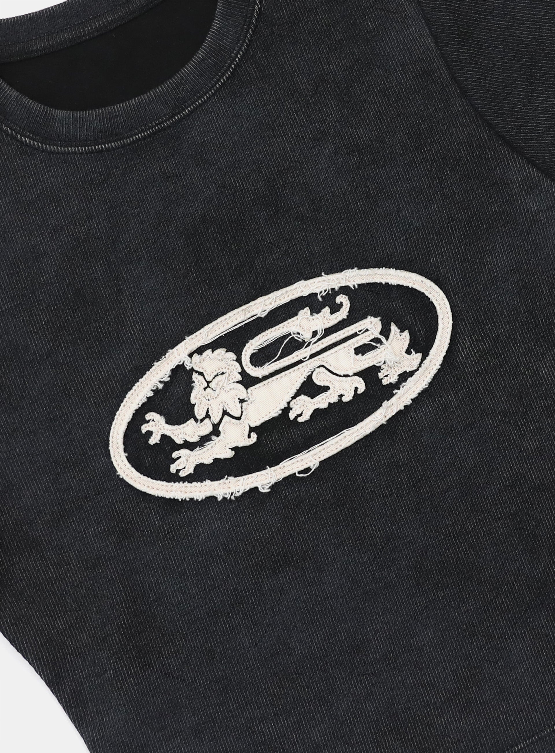 这款狮子补丁短袖修身T恤采用脏旧加工方式,展现出街头风格复古洗水效果