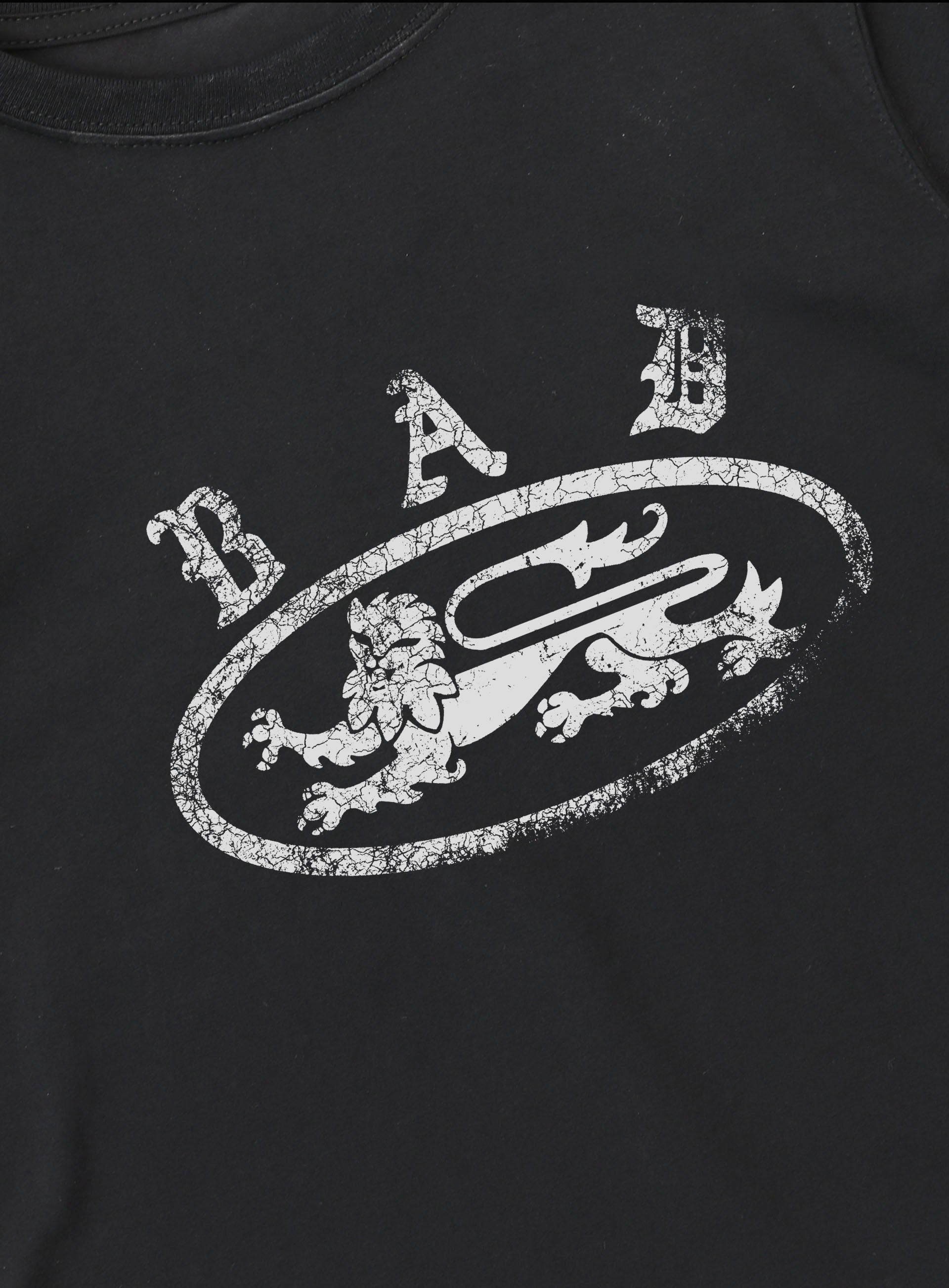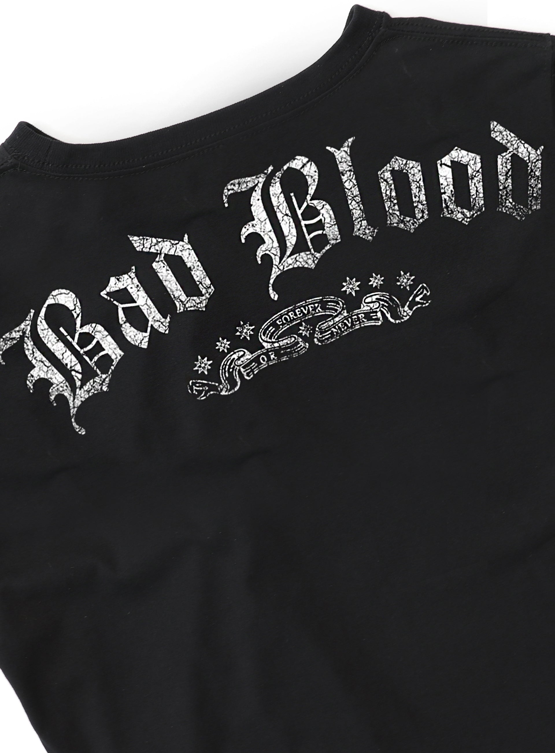 正面有做旧的 Bad 狮子徽章标志,背面有 Badblood 文凭体标志印花。