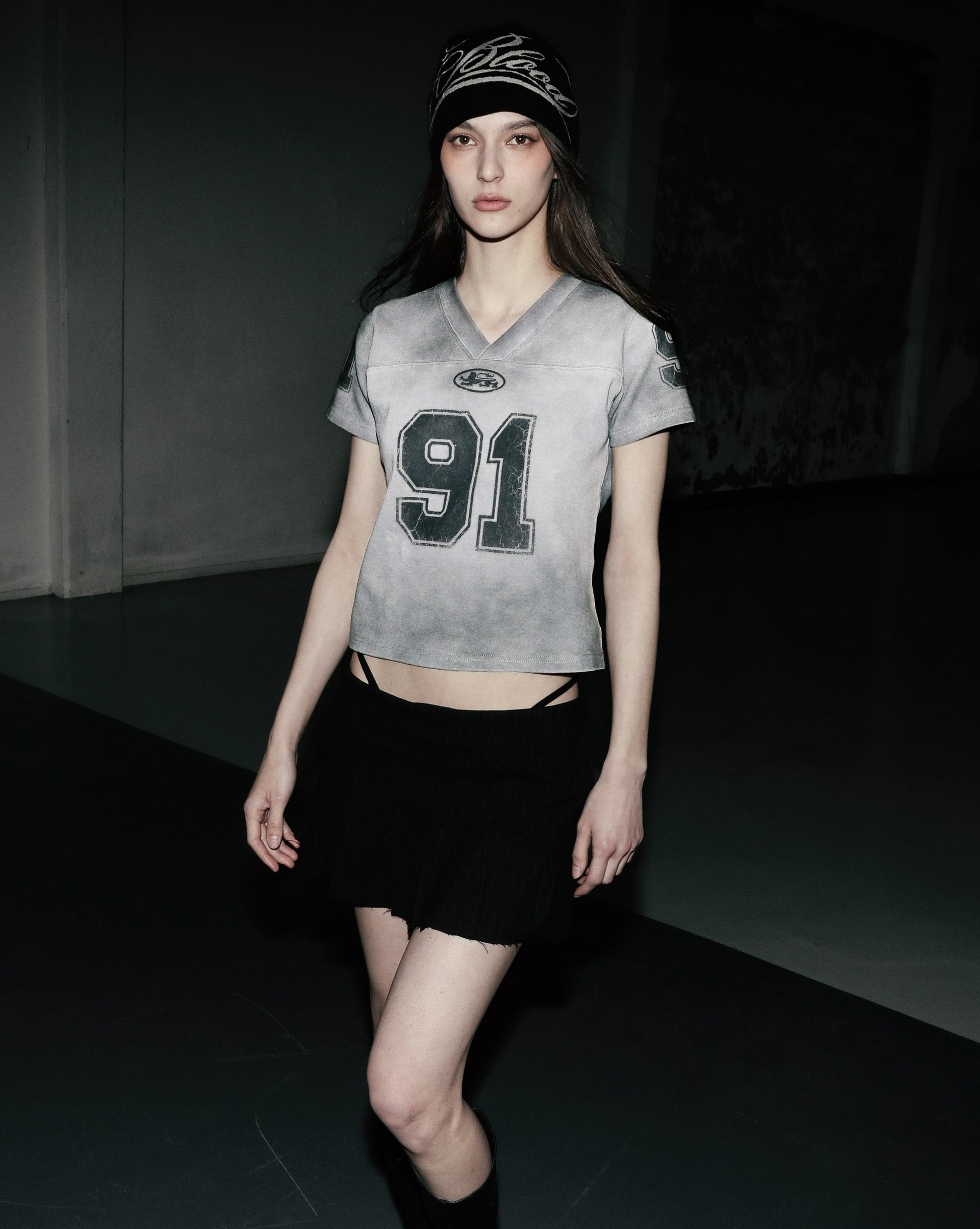 这款 91 裂纹印花 V 领 T 恤采用做旧水洗工艺,运动风格中融入复古做旧感。