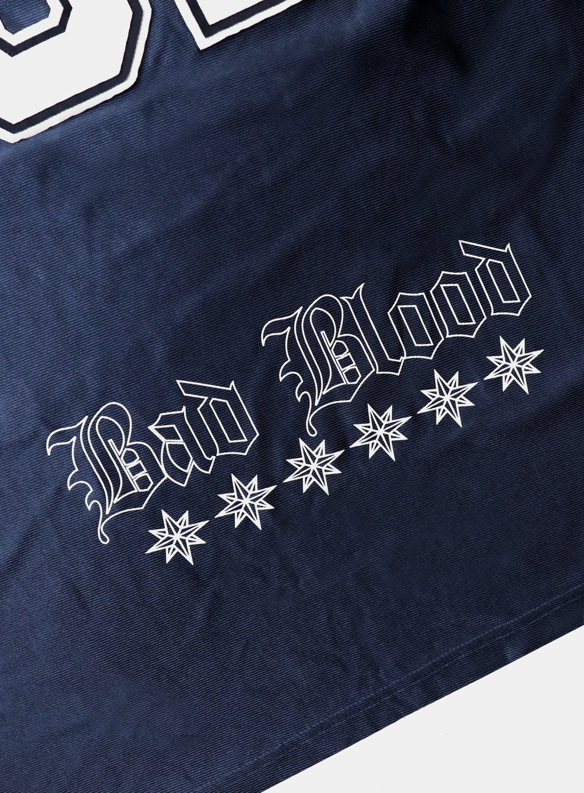 背面有大号数字补丁、底部设有 Badblood 文凭体标识。