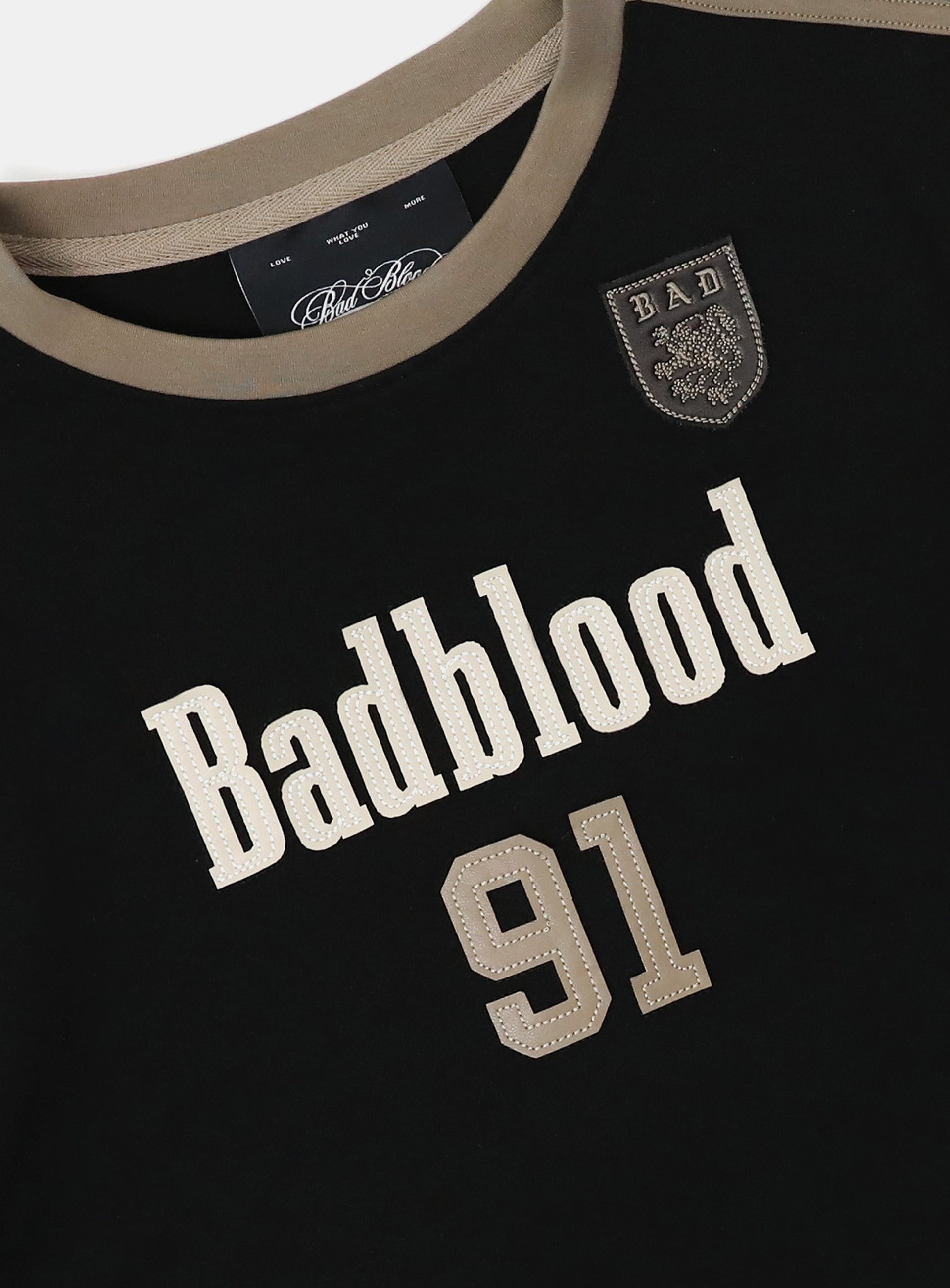 正面有 Badblood 91 皮革补丁、狮子徽章皮革补丁,背面有大号 91 皮革补丁。