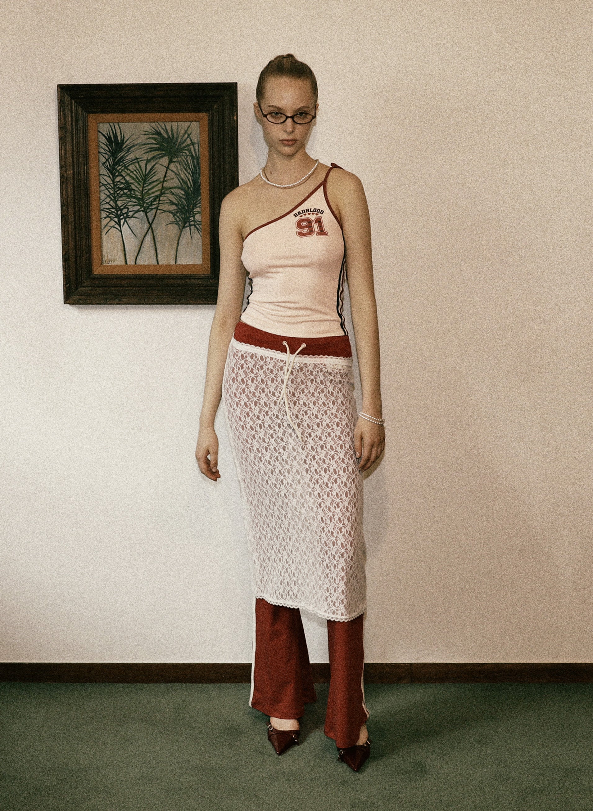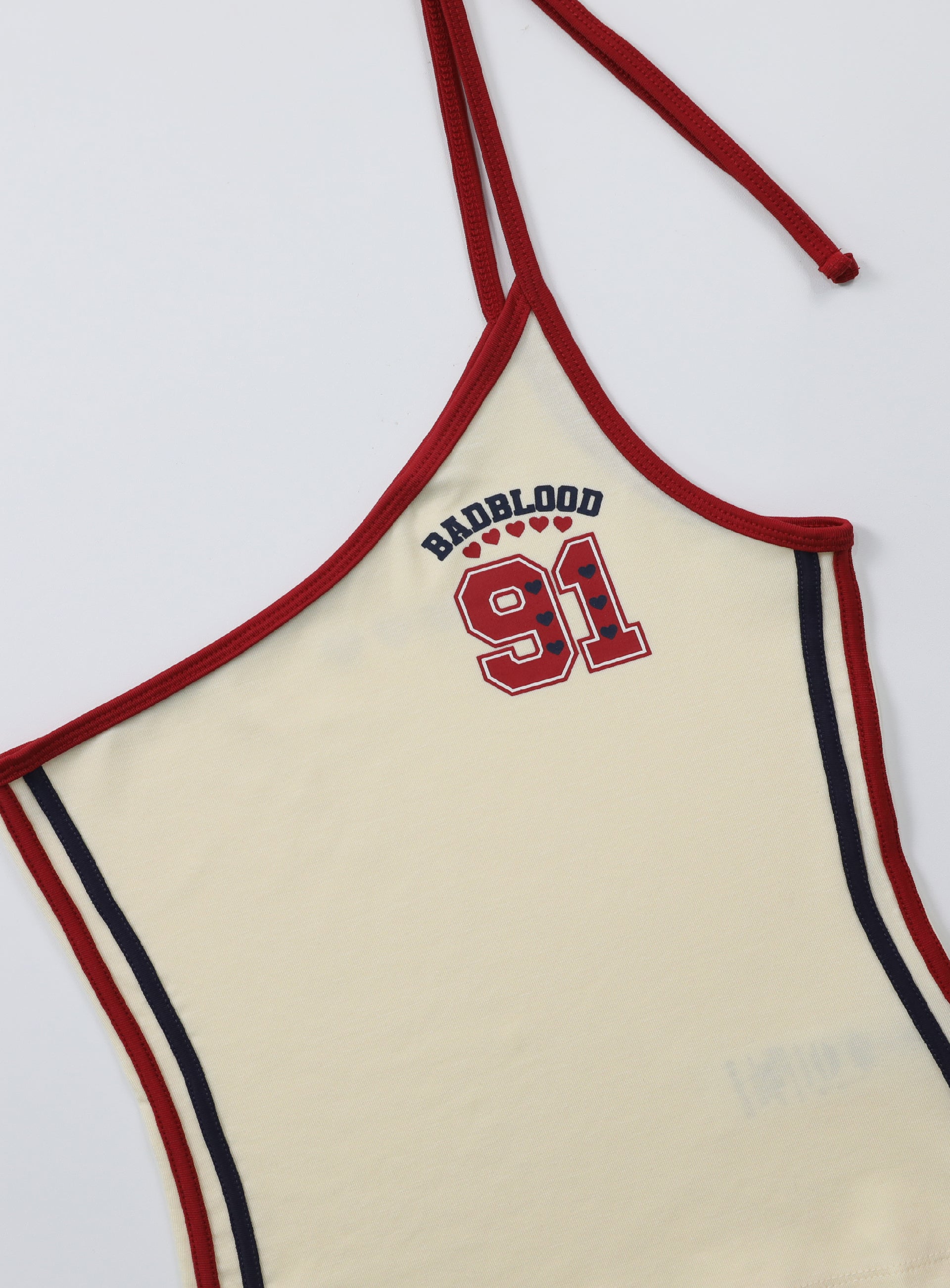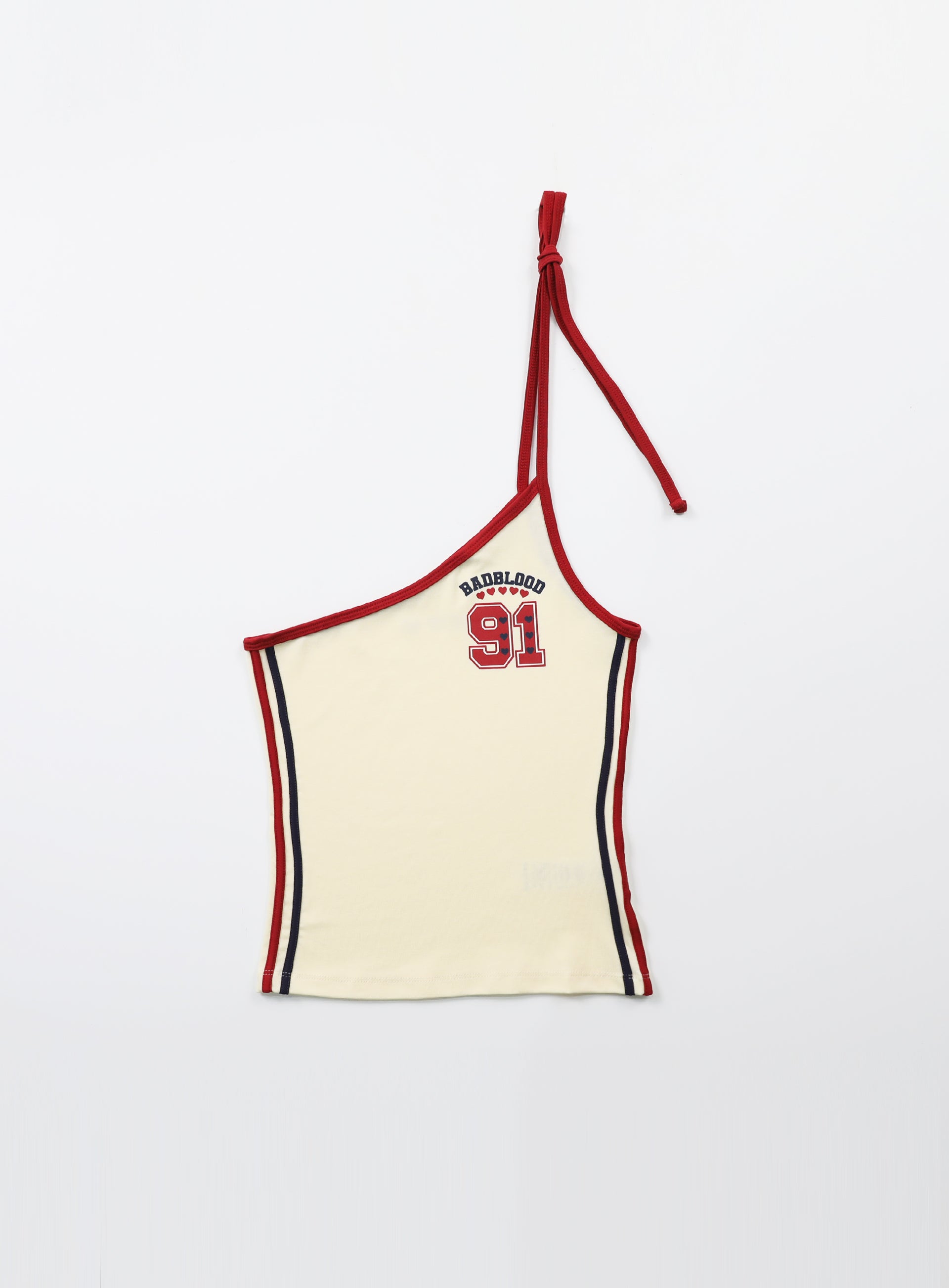 春夏季运动风设计,带有复古色彩的Cindy单肩背心。由新型纤维莱赛尔和氨纶混纺面料制成,穿着凉爽舒适。前部有复古91印花,后部带有Bad心形标志印花,侧面双色线条设计。