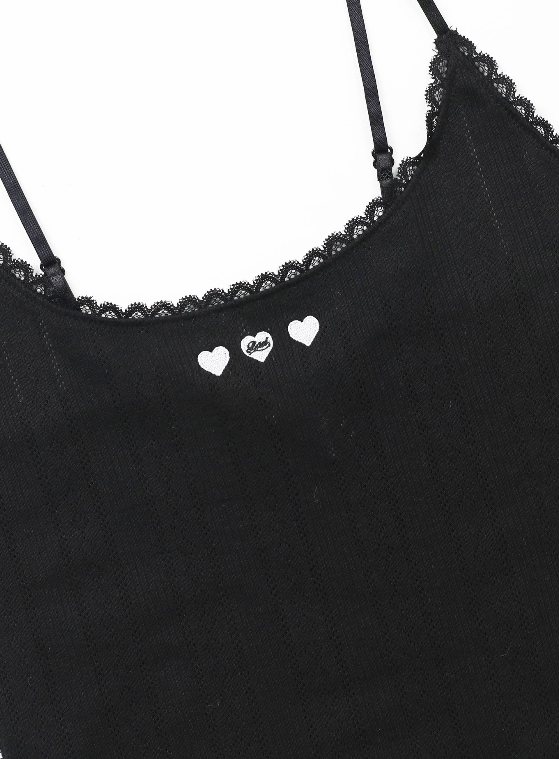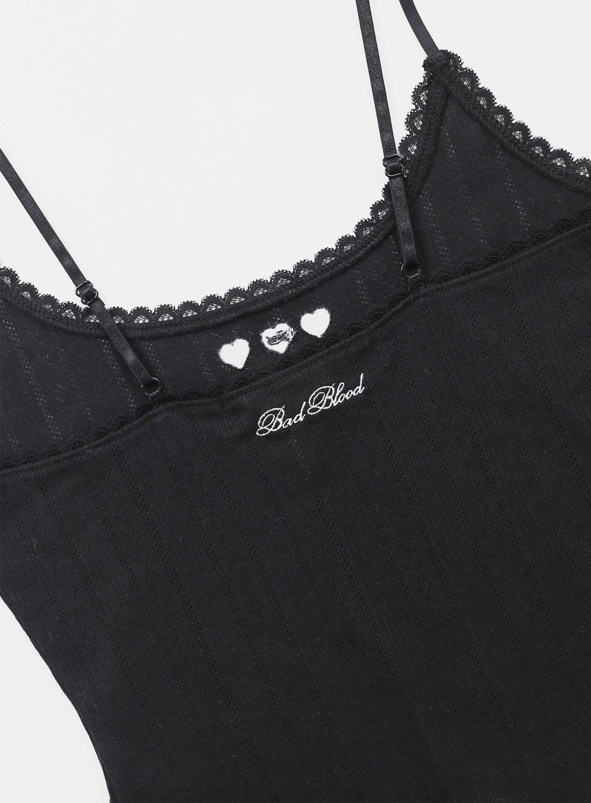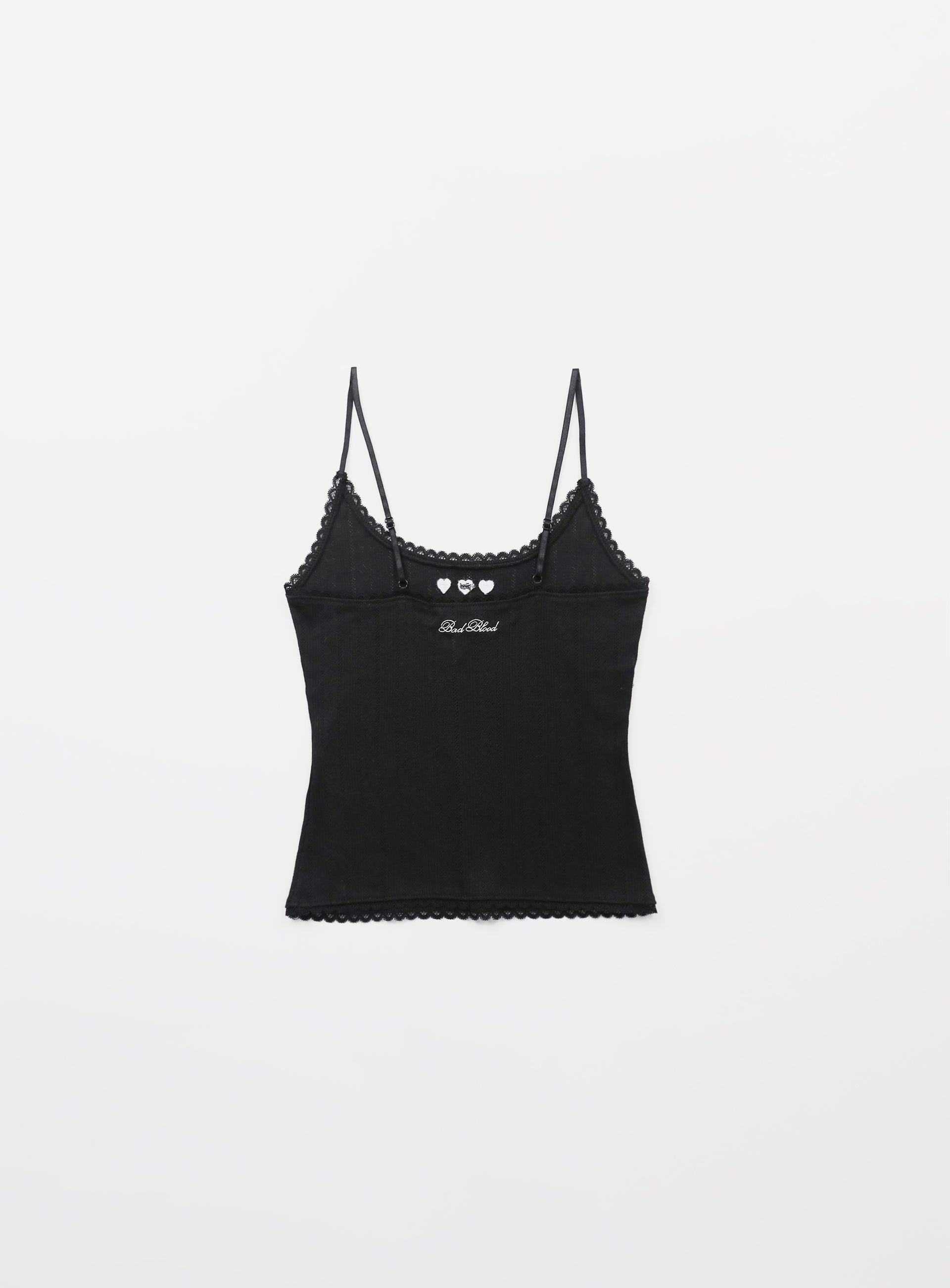 100%纯棉纱线针织面料,带来舒适穿着感的镂空设计吊带背心。U型领设计,带有可调节的细肩带,蕾丝镶边处理。前上方有Bad心形刺绣标志,后上方有Badblood文字标志。